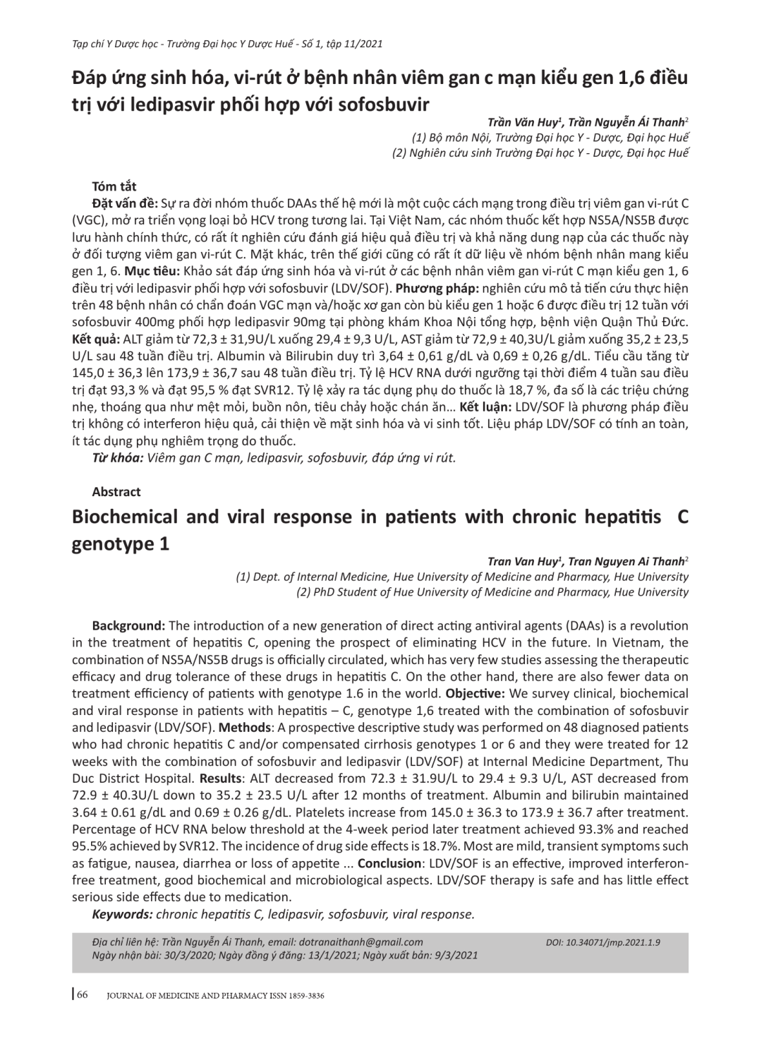 The introduction of a new generation of direct acting antiviral agents (DAAs) is a revolution in the treatment of hepatitis C, opening the prospect of eliminating HCV in the future. In Vietnam, the combination of NS5A/NS5B drugs is officially circulated, which has very few studies assessing the therapeutic efficacy and drug tolerance of these drugs in hepatitis C. On the other hand, there are also fewer data on treatment efficiency of patients with genotype 1.6 in the world. Objective: We survey clinical, biochemical and viral response in patients with hepatitis – C, genotype 1,6 treated with the combination of sofosbuvir and ledipasvir (LDV/SOF). Methods: A prospective descriptive study was performed on 48 diagnosed patients who had chronic hepatitis C and/or compensated cirrhosis genotypes 1 or 6 and they were treated for 12 weeks with the combination of sofosbuvir and ledipasvir (LDV/SOF) at Internal Medicine Department, Thu Duc District Hospital. Results: ALT decreased from 72.3 ± 31.9U/L to 29.4 ± 9.3 U/L, AST decreased from 72.9 ± 40.3U/L down to 35.2 ± 23.5 U/L after 12 months of treatment. Albumin and bilirubin maintained 3.64 ± 0.61 g/dL and 0.69 ± 0.26 g/dL. Platelets increase from 145.0 ± 36.3 to 173.9 ± 36.7 after treatment. Percentage of HCV RNA below threshold at the 4-week period later treatment achieved 93.3% and reached 95.5% achieved by SVR12. The incidence of drug side effects is 18.7%. Most are mild, transient symptoms such as fatigue, nausea, diarrhea or loss of appetite ... Conclusion: LDV/SOF is an effective, improved interferonfree treatment, good biochemical and microbiological aspects. LDV/SOF therapy is safe and has little effect serious side effects due to medication.