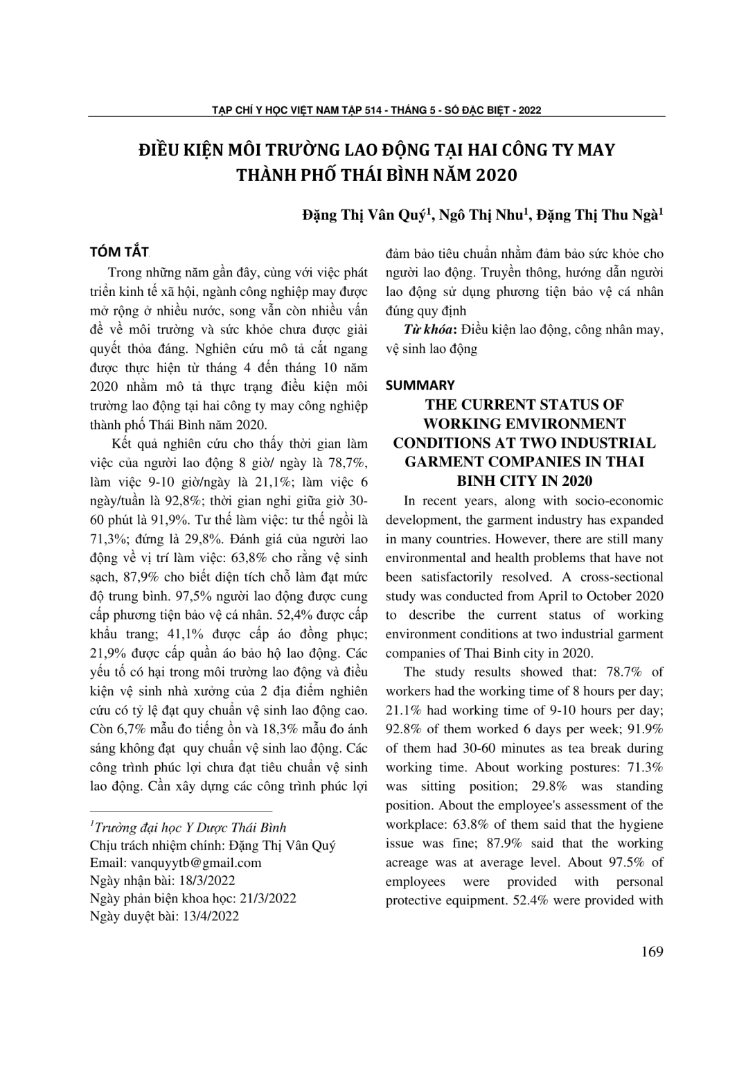 Nghiên cứu mô tả cắt ngang được thực hiện từ tháng 4 đến tháng 10 năm 2020 nhằm mô tả thực trạng điều kiện môi trường lao động tại hai công ty may công nghiệp thành phố Thái Bình năm 2020. Kết quả nghiên cứu cho thấy thời gian làm việc của người lao động 8 giờ/ ngày là 78,7%, làm việc 9-10 giờ/ngày là 21,1%; làm việc 6 ngày/tuần là 92,8%; thời gian nghỉ giữa giờ 30-60 phút là 91,9%. Tư thế làm việc: tư thế ngồi là 71,3%; đứng là 29,8%. Đánh giá của người lao động về vị trí làm việc: 63,8% cho rằng vệ sinh sạch, 87,9% cho biết diện tích chỗ làm đạt mức độ trung bình. 97,5% người lao động được cung cấp phương tiện bảo vệ cá nhân. 52,4% được cấp khẩu trang; 41,1% được cấp áo đồng phục; 21,9% được cấp quần áo bảo hộ lao động. Các yếu tố có hại trong môi trường lao động và điều kiện vệ sinh nhà xưởng của 2 địa điểm nghiên cứu có tỷ lệ đạt quy chuẩn vệ sinh lao động cao. Còn 6,7% mẫu đo tiếng ồn và 18,3% mẫu đo ánh sáng không đạt quy chuẩn vệ sinh lao động. Các công trình phúc lợi chưa đạt tiêu chuẩn vệ sinh lao động. Cần xây dựng các công trình phúc lợi đảm bảo tiêu chuẩn nhằm đảm bảo sức khỏe cho người lao động. Truyền thông, hướng dẫn người lao động sử dụng phương tiện bảo vệ cá nhân đúng quy định.