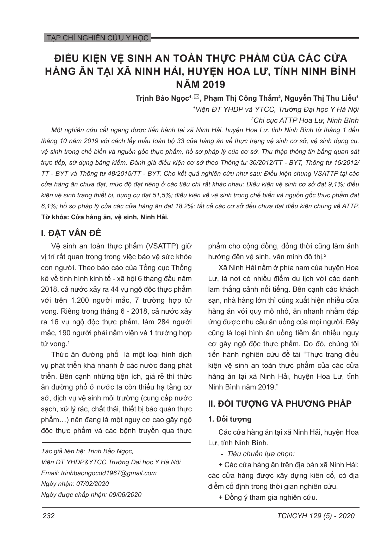 Một nghiên cứu cắt ngang được tiến hành tại xã Ninh Hải, huyện Hoa Lư, tỉnh Ninh Bình từ tháng 1 đến tháng 10 năm 2019 với cách lấy mẫu toàn bộ 33 cửa hàng ăn về thực trạng vệ sinh cơ sở, vệ sinh dụng cụ, vệ sinh trong chế biến và nguồn gốc thực phẩm, hồ sơ pháp lý của cơ sở. Thu thập thông tin bằng quan sát trực tiếp, sử dụng bảng kiểm. Đánh giá điều kiện cơ sở theo Thông tư 30/2012/TT - BYT, Thông tư 15/2012/ TT - BYT và Thông tư 48/2015/TT - BYT. Cho kết quả nghiên cứu như sau Điều kiện chung VSATTP tại các cửa hàng ăn chưa đạt, mức độ đạt riêng ở các tiêu chí rất khác nhau Điều kiện vệ sinh cơ sở đạt 9,1%; điều kiện vệ sinh trang thiết bị, dụng cụ đạt 51,5%; điều kiện về vệ sinh trong chế biến và nguồn gốc thực phẩm đạt 6,1%; hồ sơ pháp lý của các cửa hàng ăn đạt 18,2%; tất cả các cơ sở đều chưa đạt điều kiện chung về ATTP.
