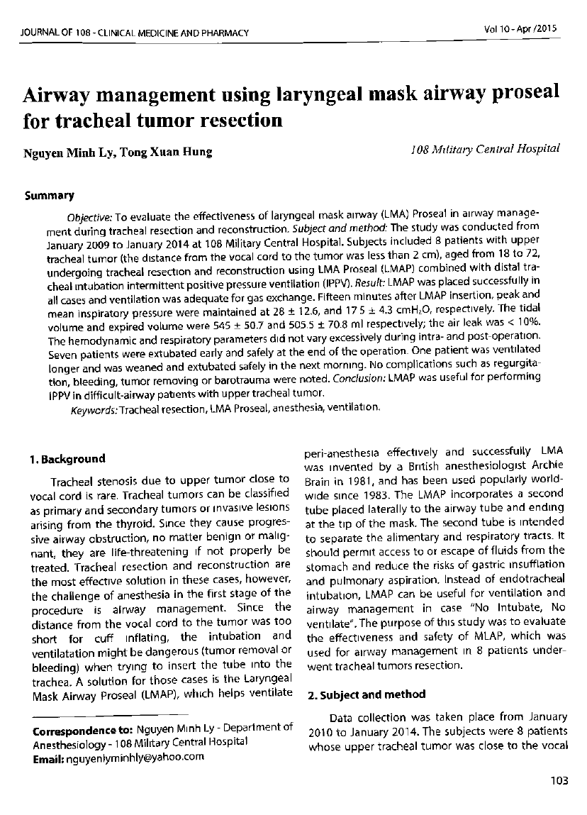 Objective: To evaluate the effectiveness of laryngeal mask airway (LMA) Proseal in airway management during tracheal resection and reconstruction. Subject and method: The study was conducted from January 2009 to January 2014 at No.108 Military Central Hospital. Subjects included 8 patients with upper tracheal tumor (the distance from the vocal cord to the tumor was less than 2 cm), aged from 18 to 72, undergoing tracheal resection and reconstruction using LMA Proseal (LMAP) combined with distal tracheal intubation intermittent positive pressure ventilation (IPPV). Result: LMAP was placed successfully in all cases and ventilation was adequate for gas exchange. Fifteen minutes after LMAP insertion, peak and mean inspiratory pressure were maintained at 28 +/- 12.6, and 17.5 +/- 4.3 cm H2O, respectively. The tidal volume and expired volume were 545 +/- 50.7 and 505.5 +/- 70.8 ml respectively; the air leak was 10 percent. The hemodynamic and respiratory parameters did not vary excessively during intra- and post-operation. Seven patients were extubated early and safely at the end of the operation. One patient was ventilated longer and was weaned and extubated safely in the next morning. No complications such as regurgitation, bleeding, tumor removing or barotrauma were noted. Conclusion: LMAP was useful for performing IPPV in difficult-airway patients with upper tracheal tumor.