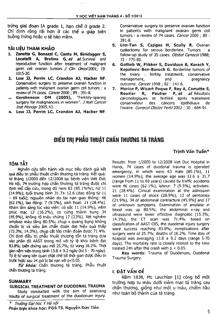 Study conducted with the aim of assessing results of surgical treatment of the duodenum injury. Results: from 1/2000 to 12/2008 Viet Duc Hospital in Hanoi, 74 cases of duodenal trauma is operated emergency, in which were :63 male (85.1 percent ), 11 women (14.9 percent ); the average age was 12.6 + or -31.7 (range from 11 to 69 years) caused by traffic accidents were 46 cases (62.1 percent ), labour: 7 (9.5 percent ), activities: 21 (28.4 percent ). Clinical examination at the admission were 11 cases of shock (28'.9 percent ), 12 of peritonitis (21.9 percent ), 34 of abdominal contracture (45.9 percent ) and 17 of unknown symptoms. Examination of amylase in blood was up 80.5 percent ; the abdominal x-ray and ultrasound were lower effective diagnostic (15.3 percent ; 14.3 percent ), the CT scan was 71.4 percent . based on classification of AAST-OIS, the duodenal injury surgery were success reaching 83.8 percent ; complications after surgery were of 25.7 percent ; deaths of 16.2 percent. Time stay in hospital was averaging 13.8 + or -'9.2 days (range 5-70 days). The mortality rate is closely related to the time treated 24h after the crash with p 0.05.