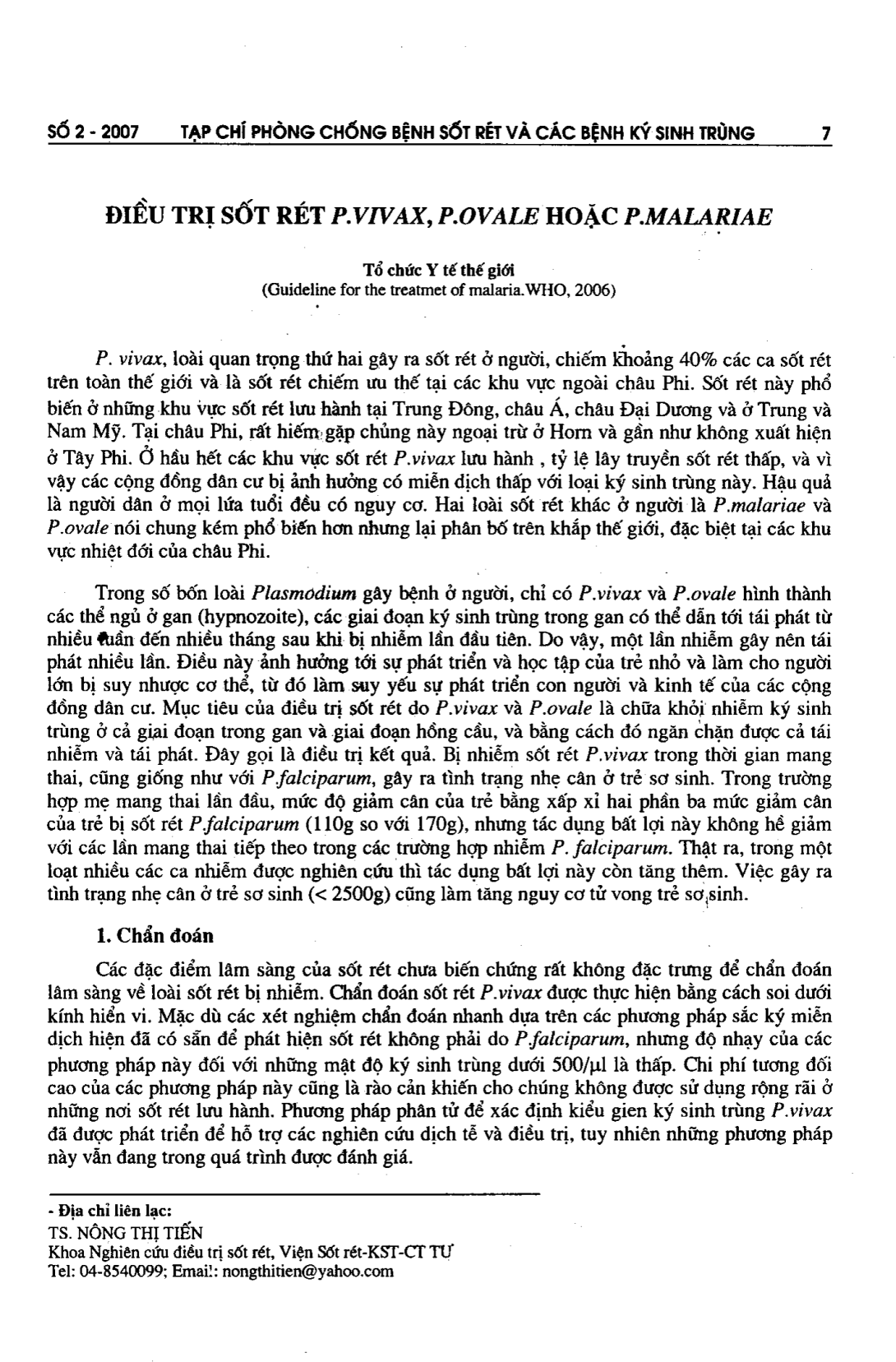 Điều trị sốt rét P, Vivax , P. Ovale hoặc P. malariae