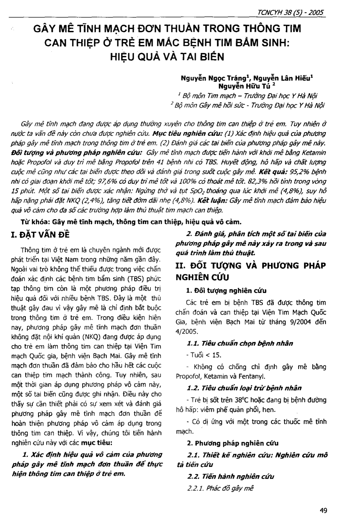Gây mê tĩnh mạch đang được áp dụng thường xuyên cho thông tim can thiệp ở trẻ em. Tuy nhiên ở nước ta vấn đề này còn chưa được nghiên cứu. Mục tiêu nghiên cứu: (1) Xác định hiệu quả của phương pháp gây mê tĩnh mạch trong thông tim ở trẻ em; (2) Đánh giá các tai biến của phương pháp gây mê này. Gây mê tĩnh mạch được tiến hành với khởi mê bằng Ketamin hoặc Propofol và duy trì mê bằng Propofol trên 41 bệnh nhân nhi có TBS. Huyết động, hô hấp và chất lượng cuộc mê cũng như các tai biến được theo dõi và đánh giá trong suốt cuộc gây mê. 95,2% bệnh nhi có giai đoạn khởi mê tốt; 97,6% có duy trì mê tốt và 100% có thoát mê tốt. 82,3% hồi tỉnh trong vòng 15 phút. Một số tai biến được xác nhận: Ngừng thở và tụt SpO2 thoáng qua lúc khởi mê (4,8% ), suy hô hấp nặng phải đặt NKQ (2,4% ), tăng tiết đờm dãi nhẹ (4,8% ). Gây mê tĩnh mạch đảm bảo hiệu quả vô cảm cho đa số các trường hợp làm thủ thuật tim mạch can thiệp.