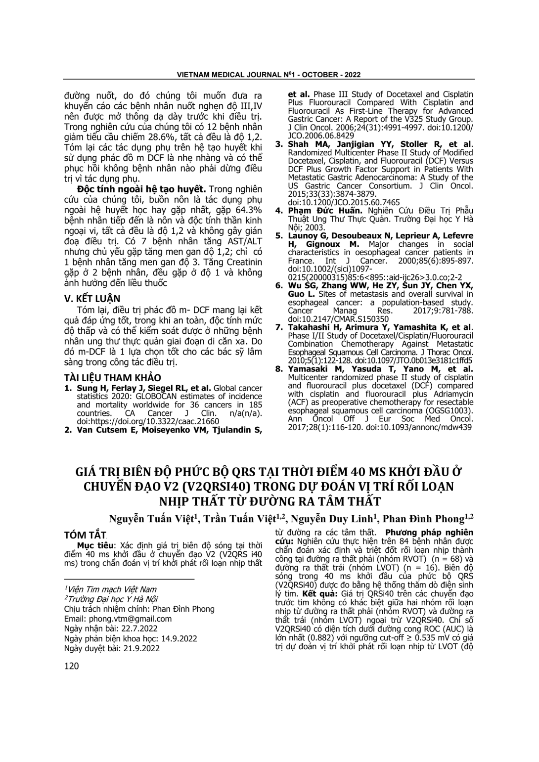 Xác định giá trị biên độ sóng tại thời điểm 40 ms khởi đầu ở chuyển đạo V2 (V2QRS i40 ms) trong chẩn đoán vị trí khởi phát rối loạn nhịp thất từ đường ra các tâm thất. Phương pháp nghiên cứu: Nghiên cứu thực hiện trên 84 bệnh nhân được chẩn đoán xác định và triệt đốt rối loạn nhịp thành công tại đường ra thất phải (nhóm RVOT) (n = 68) và đường ra thất trái (nhóm LVOT) (n = 16). Biên độ sóng trong 40 ms khởi đầu của phức bộ QRS (V2QRSi40) được đo bằng hệ thống thăm dò điện sinh lý tim. Kết quả: Giá trị QRSi40 trên các chuyển đạo trước tim không có khác biệt giữa hai nhóm rối loạn nhịp từ đường ra thất phải (nhóm RVOT) và đường ra thất trái (nhóm LVOT) ngoại trừ V2QRSi40. Chỉ số V2QRSi40 có diện tích dưới đường cong ROC (AUC) là lớn nhất (0.882) với ngưỡng cut-off ≥ 0.535 mV có giá trị dự đoán vị trí khởi phát rối loạn nhịp từ LVOT (độ nhạy 87.5% và độ đặc hiệu 89.7%). Giá trị V2QRSi40 vượt trội hơn chỉ số V2S/V3R và TZ index và tương đương với chỉ số V2 transition ratio (với AUC = 0.949). V2QRSi40 là một tiêu chuẩn có giá trị trong dự đoán vị trí khởi phát rối loạn nhịp từ đường ra các tâm thất.