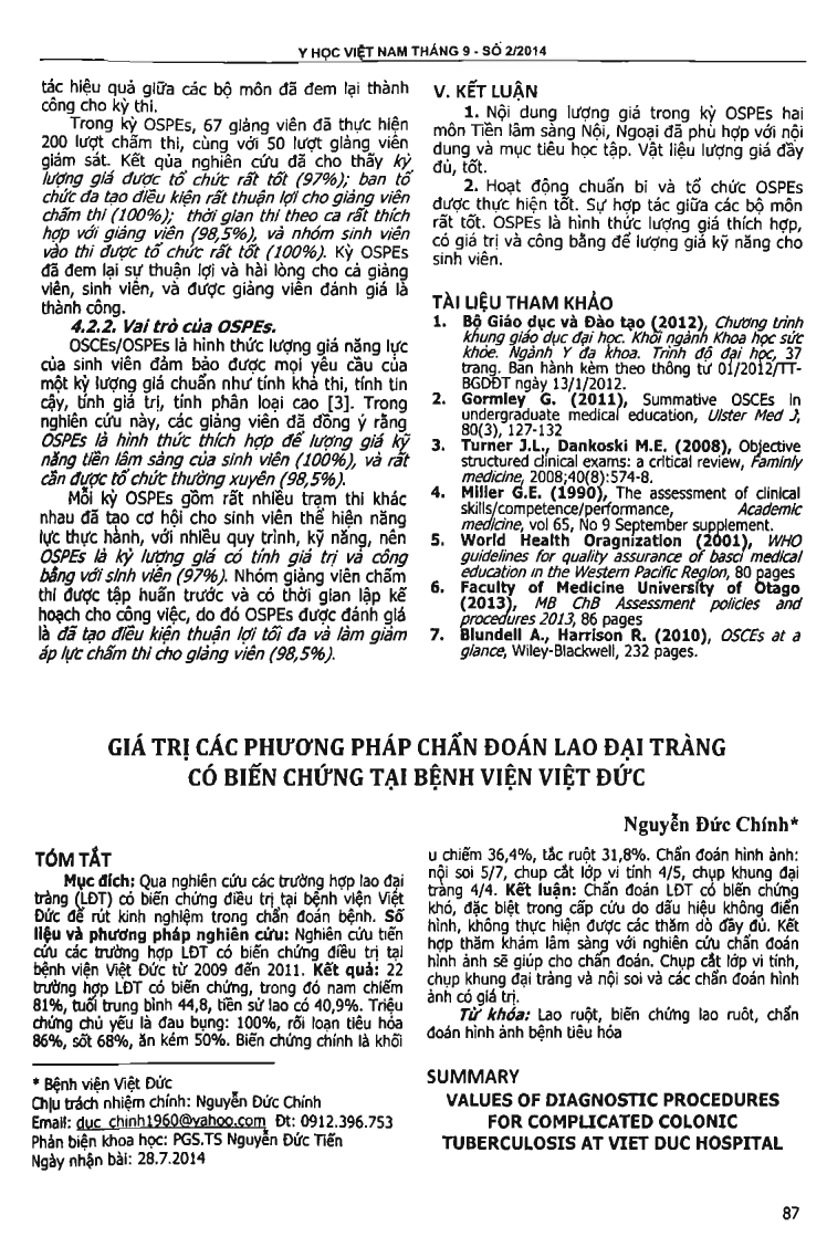 Purpose: Aim to analysis the clinical features of digestive tuberculosis, expecially colonic tuberculosis and to experience of it's diagnosis. Materials and methods: Prospective study of all colonic tuberculosis were treated at Viet Duc Hospital from 2005 to 2007. Result: There were 22 cases diagnosed colonic tuberculosis. Average age was 44,8, male patients commonly in 81 percent; Chief complaints were abdominal pain 100 percent with diarrhea or digestive disorder in 86 percent; fever 68 percent, weight loss in 50 percent. 40,9 percent has tuberculosis history. Clinical examination has found the abdominal mass in 36,4 percent, bowel obstruction 31,8 percent. Disgnosis was confirmed by Barium enema in 4/4, by colonoscopy in 5/7, crscanner 4/5. Conclusion: The diagnosis of colonic tuberculosis is still challenging due to the clinical symtom was not specific or emergency complications, or not proper examination provided. Combination of clinical and imaging exminations could be confirmed the diagnosis. crscanner, Colonoscopy and Barium enema were valuable techniques for complicated colonic tuberculosis.