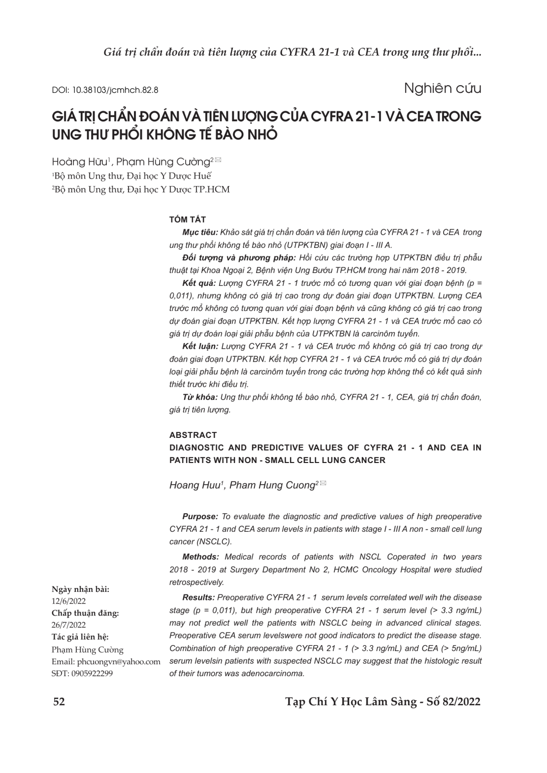 Khảo sát giá trị chẩn đoán và tiên lượng của CYFRA 21 - 1 và CEA trong ung thư phổi không tế bào nhỏ (UTPKTBN) giai đoạn I - III A. Đối tượng và phương pháp: Hồi cứu các trường hợp UTPKTBN điều trị phẫu thuật tại Khoa Ngoại 2, Bệnh viện Ung Bướu TP.HCM trong hai năm 2018 - 2019. Kết quả: Lượng CYFRA 21 - 1 trước mổ có tương quan với giai đoạn bệnh (p = 0,011), nhưng không có giá trị cao trong dự đoán giai đoạn UTPKTBN. Lượng CEA trước mổ không có tương quan với giai đoạn bệnh và cũng không có giá trị cao trong dự đoán giai đoạn UTPKTBN. Kết hợp lượng CYFRA 21 - 1 và CEA trước mổ cao có giá trị dự đoán loại giải phẫu bệnh của UTPKTBN là carcinôm tuyến. Kết luận: Lượng CYFRA 21 - 1 và CEA trước mổ không có giá trị cao trong dự đoán giai đoạn UTPKTBN. Kết hợp CYFRA 21 - 1 và CEA trước mổ có giá trị dự đoán loại giải phẫu bệnh là carcinôm tuyến trong các trường hợp không thể có kết quả sinh thiết trước khi điều trị.