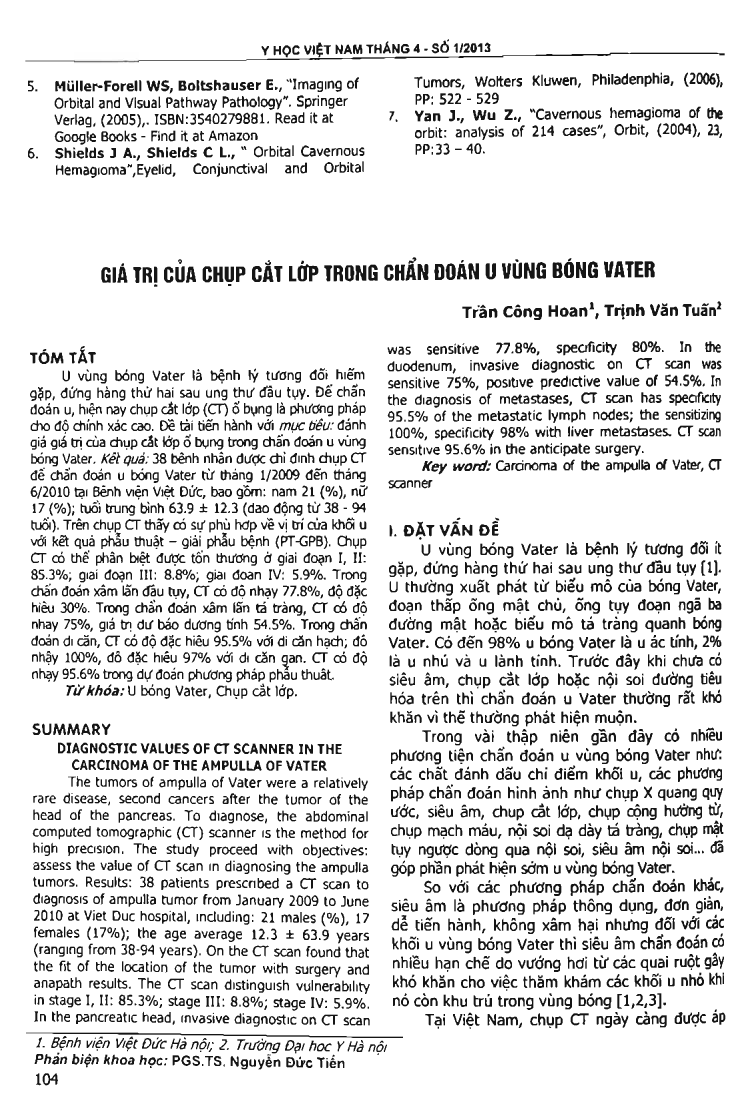 The tumors of ampulla of Vater were a relatively rare disease, second cancers after the tumor of the head of the pancreas. To diagnose, the abdominal computed tomographic (CT) scanner is the method for high precision. The study proceed with objectives: assess the value of CT scan in diagnosing the ampulla tumors. Results: 38 patients prescribed a CT scan to diagnosis of ampulla tumor from January 2009 to June 2010 at Viet-Duc Hospital, including: 21 males ( percent ), 17 females (17 percent ); the age average 12.3 + or - 63.9 years (ranging from 38-94 years). On the cr scan found that the fit of the location of the tumor with surgery and anapath results. The cr scan distinguish vulnerability in stage I, II: 85.3 percent; stage III: 8.8 percent; stage IV: 5.9 percent. In the pancreatic head, invasive diagnostic on CT scan was sensitive 77.8 percent, specificity 80 percent. In the duodenum, invasive diagnostic on CT scan was sensitive 75 percent, positive predictive value of 54.5 percent. In the diagnosis of metastases, CT scan has specificity 95.5 percent of the metastatic lymph nodes; the sensitizing 100 percent, specificity 98 percent with liver metastases. CT scan sensitive 95.6 percent in the anticipate surgery.