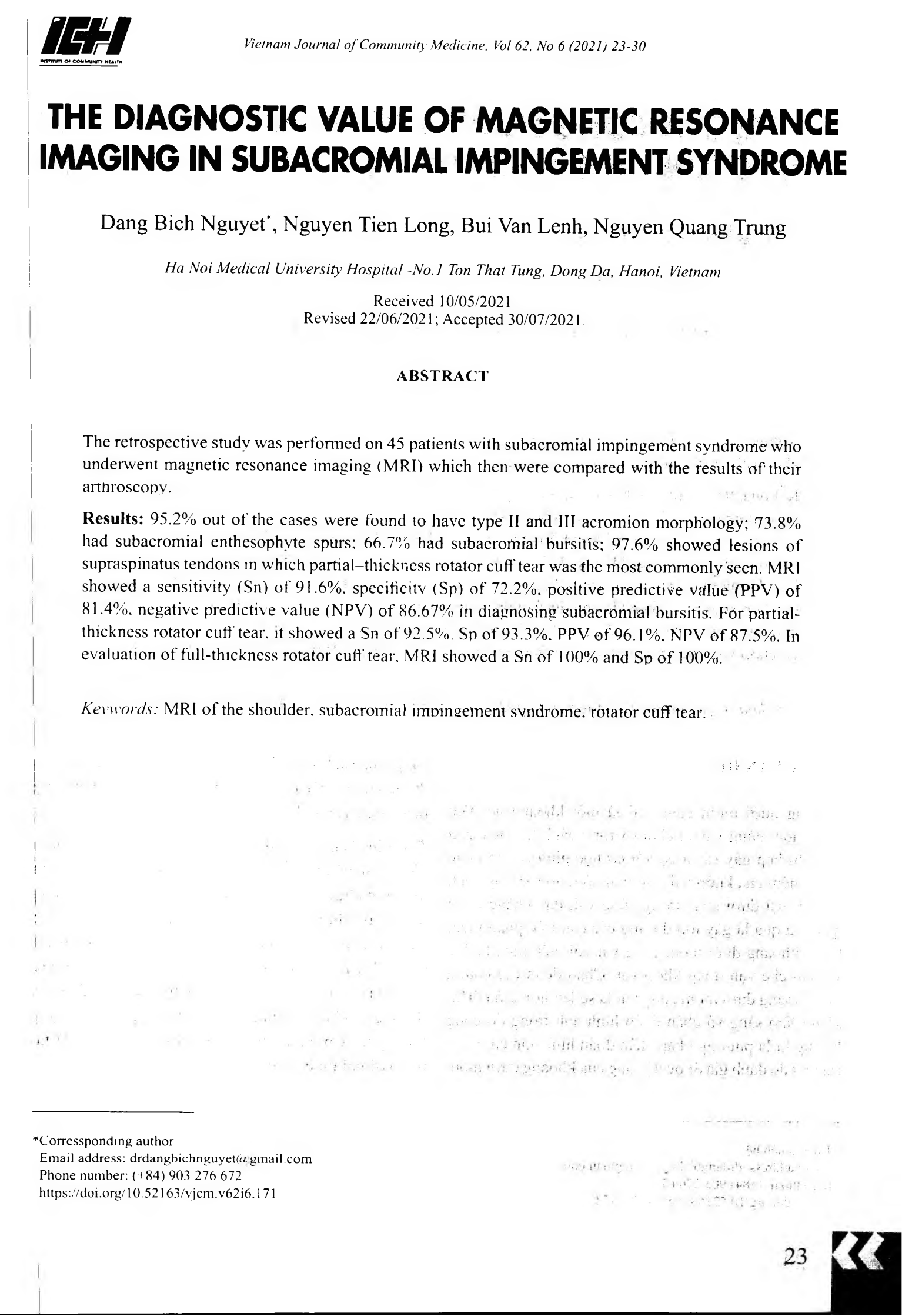Nghiên cứu tiến hành trên 42 bệnh nhân hẹp khoang dưới mỏm cùng vai, được chụp cộng hưởng từ khớp vai, được đối chiếu với kết quả nội soi khớp vai. Kết quả: 95.2% trường hợp có mỏm cùng vai dạng 2 và dạng 3; 73.8% trường hợp có gai xương mặt dưới mỏm cùng vai; 66.7% trường hợp có viêm bao hoạt dịch dưới mỏm cùng vai; 97.6% trường hợp có tổn thương gân trên gai trong đó chủ yếu là rách bán phần gân. Cộng hưởng từ chẩn đoán viêm bao hoạt dịch trong hẹp khoang dưới mỏm cùng vai có độ nhạy 91,6%, độ đặc hiệu 72,2%, giá trị dự báo dương tính 81,4%, giá trị dự báo âm tính 86,67%. Cộng hưởng từ chẩn đoán rách bán phần gân cơ chóp xoay trong hẹp khoang dưới mỏm cùng vai có độ nhạy 92,5%, độ đặc hiệu 93,3%, giá trị dự báo dương tính 96,1%, giá trị dự báo âm tính 87,5%. Cộng hưởng từ chẩn đoán rách hoàn toàn gân cơ chóp xoay trong hẹp khoang dưới mỏm cùng vai có độ nhạy 100%, độ đặc hiệu 100%.