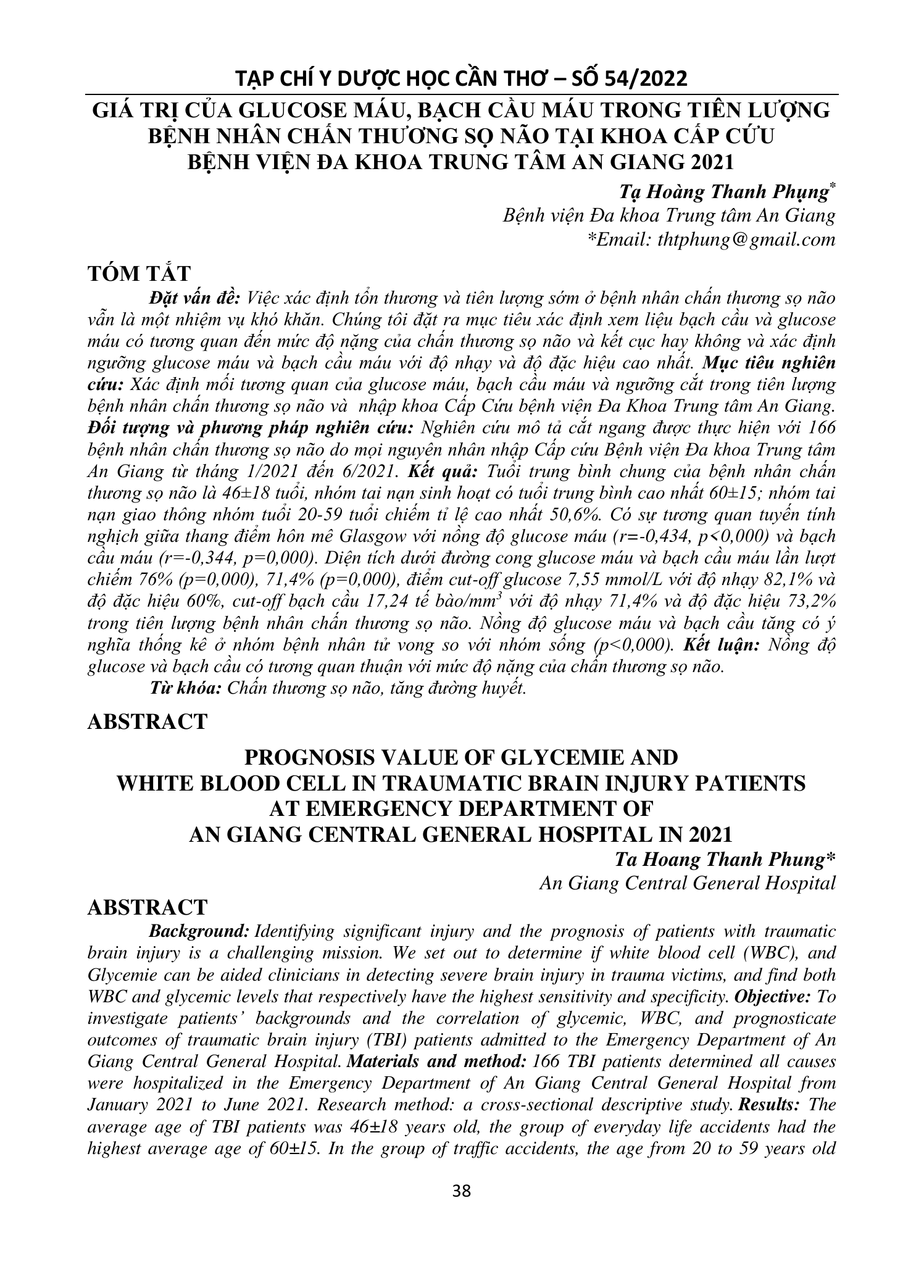 Xác định mối tương quan của glucose máu, bạch cầu máu và ngưỡng cắt trong tiên lượng bệnh nhân chấn thương sọ não và nhập khoa Cấp Cứu bệnh viện Đa Khoa Trung tâm An Giang. Đối tượng và phương pháp nghiên cứu: Nghiên cứu mô tả cắt ngang được thực hiện với 166 bệnh nhân chấn thương sọ não do mọi nguyên nhân nhập Cấp cứu Bệnh viện Đa khoa Trung tâm An Giang từ tháng 1/2021 đến 6/2021. Kết quả: Tuổi trung bình chung của bệnh nhân chấn thương sọ não là 46±18 tuổi, nhóm tai nạn sinh hoạt có tuổi trung bình cao nhất 60±15; nhóm tai nạn giao thông nhóm tuổi 20-59 tuổi chiếm tỉ lệ cao nhất 50,6%. Có sự tương quan tuyến tính nghịch giữa thang điểm hôn mê Glasgow với nồng độ glucose máu (r=-0,434, p<0,000) và bạch cầu máu (r=-0,344, p=0,000). Diện tích dưới đường cong glucose máu và bạch cầu máu lần lượt chiếm 76% (p=0,000), 71,4% (p=0,000), điểm cut-off glucose 7,55 mmol/L với độ nhạy 82,1% và độ đặc hiệu 60%, cut-off bạch cầu 17,24 tế bào/mm3 với độ nhạy 71,4% và độ đặc hiệu 73,2% trong tiên lượng bệnh nhân chấn thương sọ não. Nồng độ glucose máu và bạch cầu tăng có ý nghĩa thống kê ở nhóm bệnh nhân tử vong so với nhóm sống (p<0,000). Kết luận: Nồng độ glucose và bạch cầu có tương quan thuận với mức độ nặng của chấn thương sọ não.