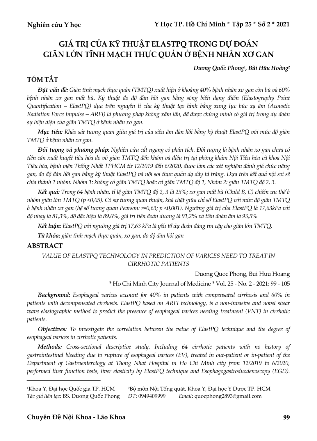 Khảo sát tương quan giữa giá trị của siêu âm đàn hồi bằng kỹ thuật ElastPQ với mức độ giãn TMTQ ở bệnh nhân xơ gan. Đối tượng và phương pháp: Nghiên cứu cắt ngang có phân tích. Đối tượng là bệnh nhân xơ gan chưa có tiền căn xuất huyết tiêu hóa do vỡ giãn TMTQ đến khám và điều trị tại phòng khám Nội Tiêu hóa và khoa Nội Tiêu hóa, bệnh viện Thống Nhất TPHCM từ 12/2019 đến 6/2020, được làm các xét nghiệm đánh giá chức năng gan, đo độ đàn hồi gan bằng kỹ thuật ElastPQ và nội soi thực quản dạ dày tá tràng. Dựa trên kết quả nội soi sẽ chia thành 2 nhóm: Nhóm 1: không có giãn TMTQ hoặc có giãn TMTQ độ 1, Nhóm 2: giãn TMTQ độ 2, 3. Kết quả: Trong 64 bệnh nhân, tỉ lệ giãn TMTQ độ 2, 3 là 25%; xơ gan mất bù (Child B, C) chiếm ưu thế ở nhóm giãn lớn TMTQ (p <0,05). Có sự tương quan thuận, khá chặt giữa chỉ số ElastPQ với mức độ giãn TMTQ ở bệnh nhân xơ gan (hệ số tương quan Pearson: r=0,63; p <0,001). Ngưỡng giá trị của ElastPQ là 17,63kPa với độ nhạy là 81,3%, độ đặc hiệu là 89,6%, giá trị tiên đoán dương là 91,2% và tiên đoán âm là 93,5% Kết luận: ElastPQ với ngưỡng giá trị 17,63 kPa là yếu tố dự đoán đáng tin cậy cho giãn lớn TMTQ.
