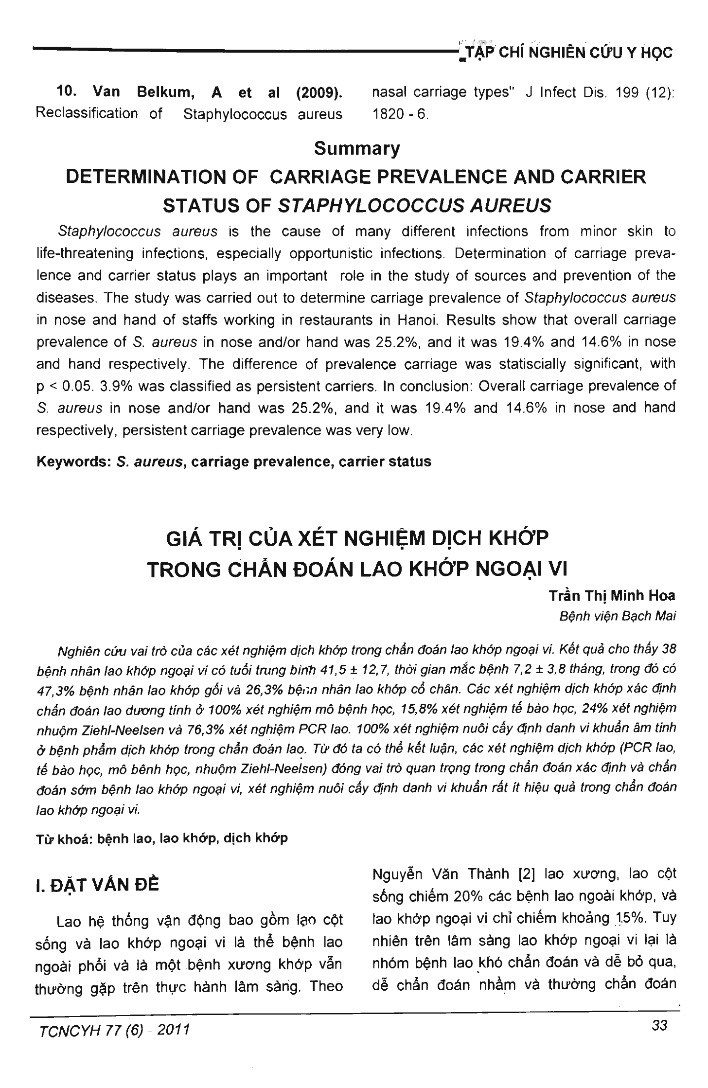 The study was carried out to determine the value of synovial fluid examination for joint tuberculous diagnosed. The results show that, 38 patients with joint tuberculous with mean age 41.5 + or - 12.7, disease duration 7.2 + or - 3.8 months. There were 47.3 percent patients with knee tuberculosis, 26.3 percent patients with ankle tuberculosis. Synovial fluid analysis for tuberculous diagnosed positive in 100 percent hystopathological stain, 15.8 percent cytology smear, 24 percent Ziehl-Neelsen stain and 76.3 percent PCR analysis. There was negative 100 percent with method bacteria culture. In conclusion, synovial fluid analysis (PCR, cytology, hystopathological, Ziehl-Neelsen stain) have an inportance role in diagnosed and early diagnosed joint tuberculous, but indentification of bacteria culture.