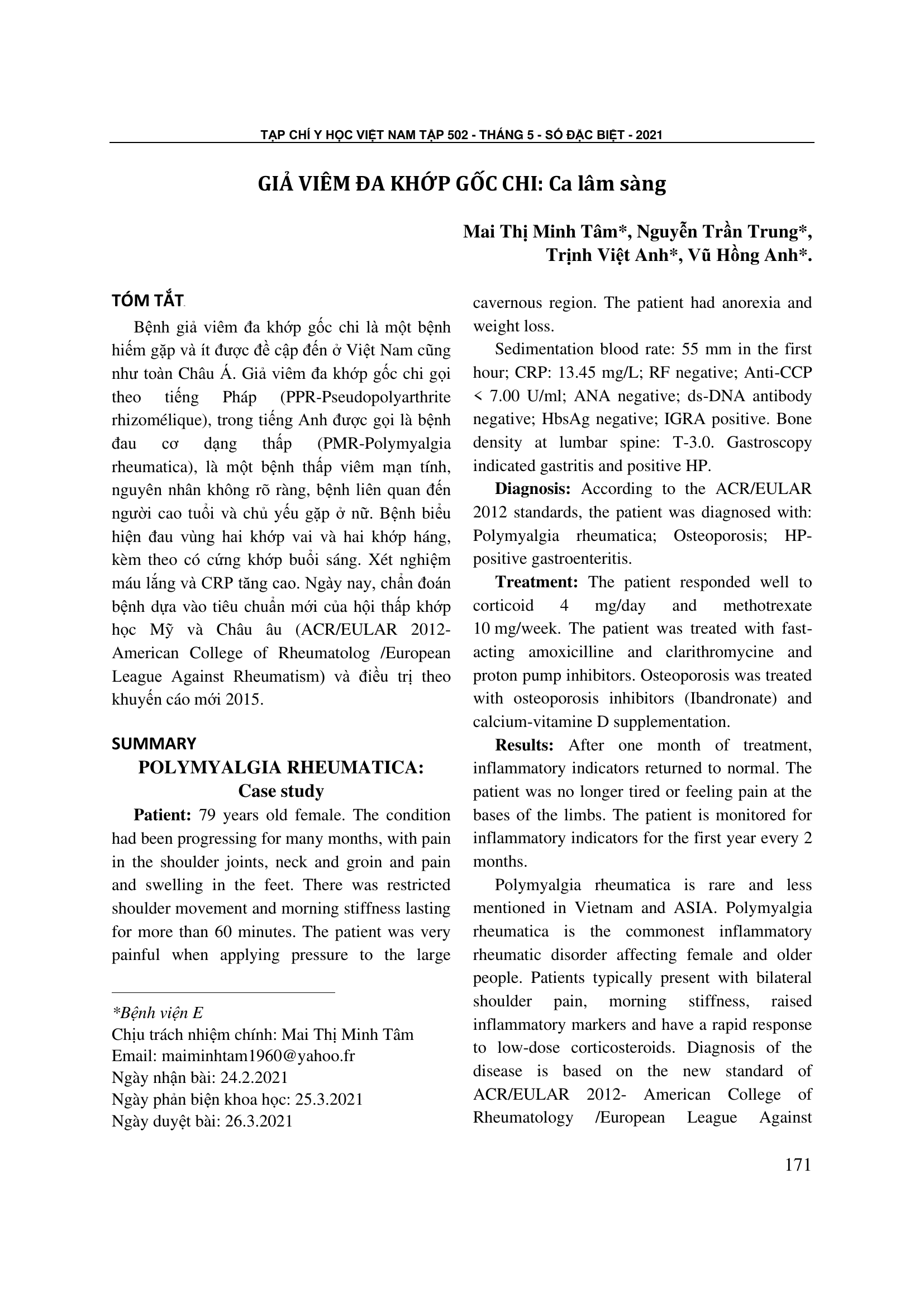 Bệnh giả viêm đa khớp gốc chi là một bệnh hiếm gặp và ít được đề cập đến ở Việt Nam cũng như toàn Châu Á. Giả viêm đa khớp gốc chi gọi theo tiếng Pháp (PPR-Pseudopolyarthrite rhizomélique), trong tiếng Anh được gọi là bệnh đau cơ dạng thấp (PMR-Polymyalgia rheumatica), là một bệnh thấp viêm mạn tính, nguyên nhân không rõ ràng, bệnh liên quan đến người cao tuổi và chủ yếu gặp ở nữ. Bệnh biểu hiện đau vùng hai khớp vai và hai khớp háng, kèm theo có cứng khớp buổi sáng. Xét nghiệm máu lắng và CRP tăng cao. Ngày nay, chẩn đoán bệnh dựa vào tiêu chuẩn mới của hội thấp khớp học Mỹ và Châu âu (ACR/EULAR 2012- American College of Rheumatolog /European League Against Rheumatism) và điều trị theo khuyến cáo mới 2015.