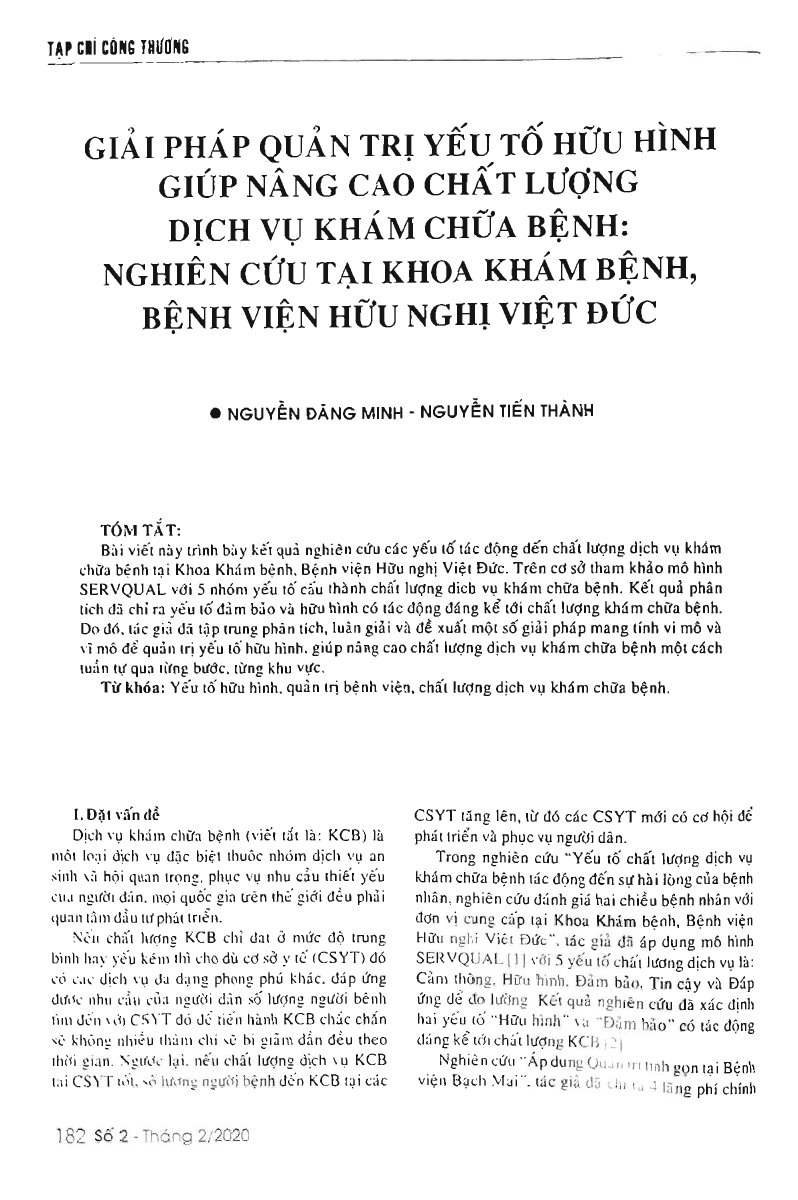 Giải pháp quản trị yếu tố hữu hình giúp nâng cao chất lượng dịch vụ khám chữa bệnh: Nghiên cứu tại khoa khám bệnh, Bệnh viện Hữu nghị Việt Đức