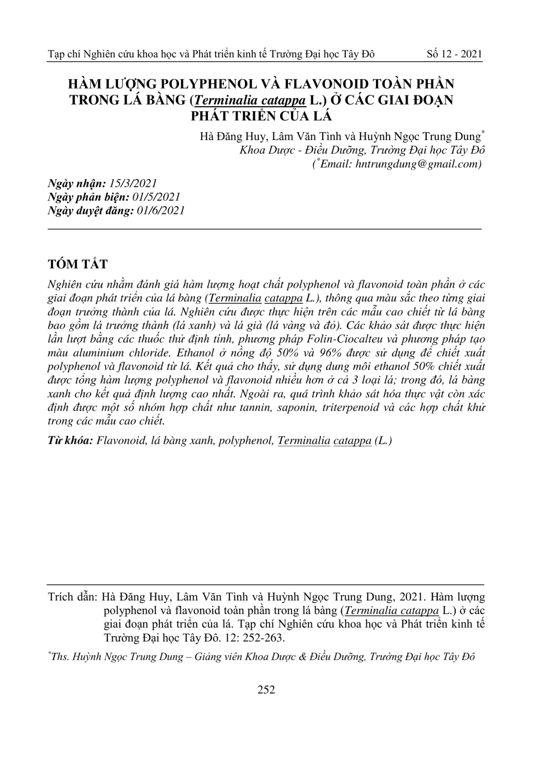 Đánh giá hàm lượng hoạt chất polyphenol và flavonoid toàn phần ở các giai đoạn phát triển của lá bàng (Terminalia catappa L.), thông qua màu sắc theo từng giai đoạn trưởng thành của lá. Nghiên cứu được thực hiện trên các mẫu cao chiết từ lá bàng bao gồm lá trưởng thành (lá xanh) và lá già (lá vàng và đỏ). Các khảo sát được thực hiện lần lượt bằng các thuốc thử định tính, phương pháp Folin-Ciocalteu và phương pháp tạo màu aluminium chloride. Ethanol ở nồng độ 50% và 96% được sử dụng để chiết xuất polyphenol và flavonoid từ lá. Kết quả cho thấy, sử dụng dung môi ethanol 50% chiết xuất được tổng hàm lượng polyphenol và flavonoid nhiều hơn ở cả 3 loại lá; trong đó, lá bàng xanh cho kết quả định lượng cao nhất. Ngoài ra, quá trình khảo sát hóa thực vật còn xác định được một số nhóm hợp chất như tannin, saponin, triterpenoid và các hợp chất khử trong các mẫu cao chiết.