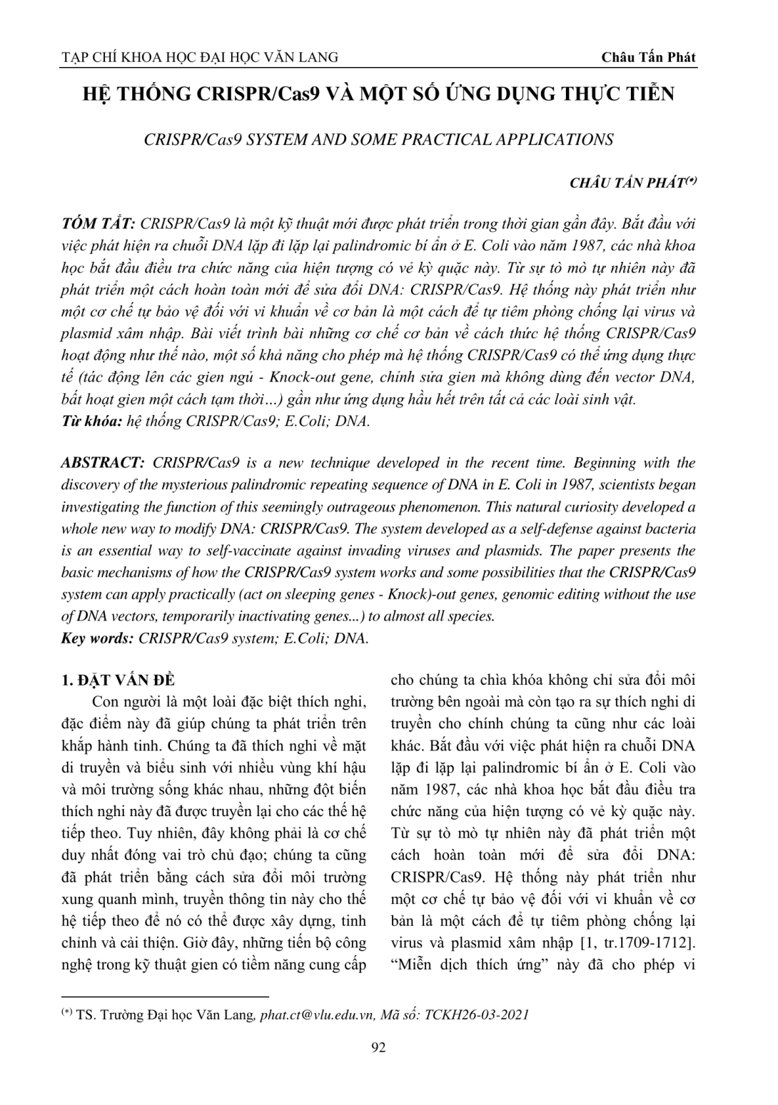 CRISPR/Cas9 là một kỹ thuật mới được phát triển trong thời gian gần đây. Bắt đầu với việc phát hiện ra chuỗi DNA lặp đi lặp lại palindromic bí ẩn ở E. Coli vào năm 1987, các nhà khoa học bắt đầu điều tra chức năng của hiện tượng có vẻ kỳ quặc này. Từ sự tò mò tự nhiên này đã phát triển một cách hoàn toàn mới để sửa đổi DNA: CRISPR/Cas9. Hệ thống này phát triển như một cơ chế tự bảo vệ đối với vi khuẩn về cơ bản là một cách để tự tiêm phòng chống lại virus và plasmid xâm nhập. Bài viết trình bài những cơ chế cơ bản về cách thức hệ thống CRISPR/Cas9 hoạt động như thế nào, một số khả năng cho phép mà hệ thống CRISPR/Cas9 có thể ứng dụng thực tế (tác động lên các gien ngủ - Knock-out gene, chỉnh sửa gien mà không dùng đến vector DNA, bất hoạt gien một cách tạm thời…) gần như ứng dụng hầu hết trên tất cả các loài sinh vật.