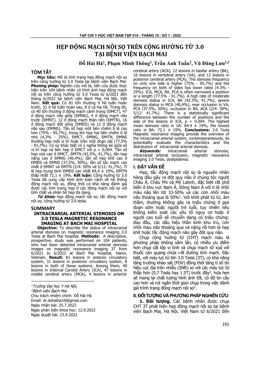 Mô tả tình trạng hẹp động mạch nội sọ trên cộng hưởng từ 3.0 Tesla tại bệnh viện Bạch Mai. Nghiên cứu mô tả, tiến cứu được thực hiện trên 104 bệnh nhân có hình ảnh hẹp động mạch nội sọ trên cộng hưởng từ 3.0 Tesla từ 6/2021 đến tháng 6/2022 tại bệnh viện Bạch Mai, Hà Nội, Việt Nam. Có 81 tổn thương ở hệ tuần hoàn trước, 31 ở hệ tuần hoàn sau, 8 ở cả hai hệ. Trong đó, có 40 tổn thương ở động mạch cảnh trong (ĐMCT), 47 ở động mạch não giữa (ĐMNG), 4 ở động mạch não trước (ĐMNT), 12 ở động mạch thân nền (ĐMTN), 16 ở động mạch đốt sống (ĐMĐS) và 12 ở động mạch não sau (ĐMNS). Tần số hẹp một bên chiêm tỉ lệ cao hơn (75% - 95,7%), trong khi hẹp hai bên chiếm tỉ lệ nhỏ (4,3% - 25%). ĐMCT, ĐMNG, ĐMTN, ĐMNS thường hẹp một vị trí hoặc trên một đoạn dài (77,5% - 91,7%). Có sự khác biệt có ý nghĩa thống kê giữa số vị trí hẹp và bên hẹp ở ĐMCT với p = 0,004. Tần số hẹp vừa cao ở ĐMCT, ĐMTN (42,5%, 41,7%), tần hẹp nặng cao ở ĐMNG (40,4%), tần số hẹp khít cao ở ĐMĐS và ĐMNS (37,5%, 50%), tần số tắc mạch cao nhất ở ĐMNT và ĐMTN (2/4: 50% và 5/12: 41,7%). Tỉ lệ hẹp trung bình ĐMĐS cao nhất 84,4 ± 19%, ĐMTN thấp nhất 72,1 ± 19%. Kết luận: Cộng hưởng từ 3.0 Tesla đã cung cấp hình ảnh toàn cảnh về hệ thống động mạch nội sọ, đồng thời có khả năng đánh giá được các tình trạng hẹp ở các động mạch nội sọ với tính chất và phân bố hẹp đa dạng.