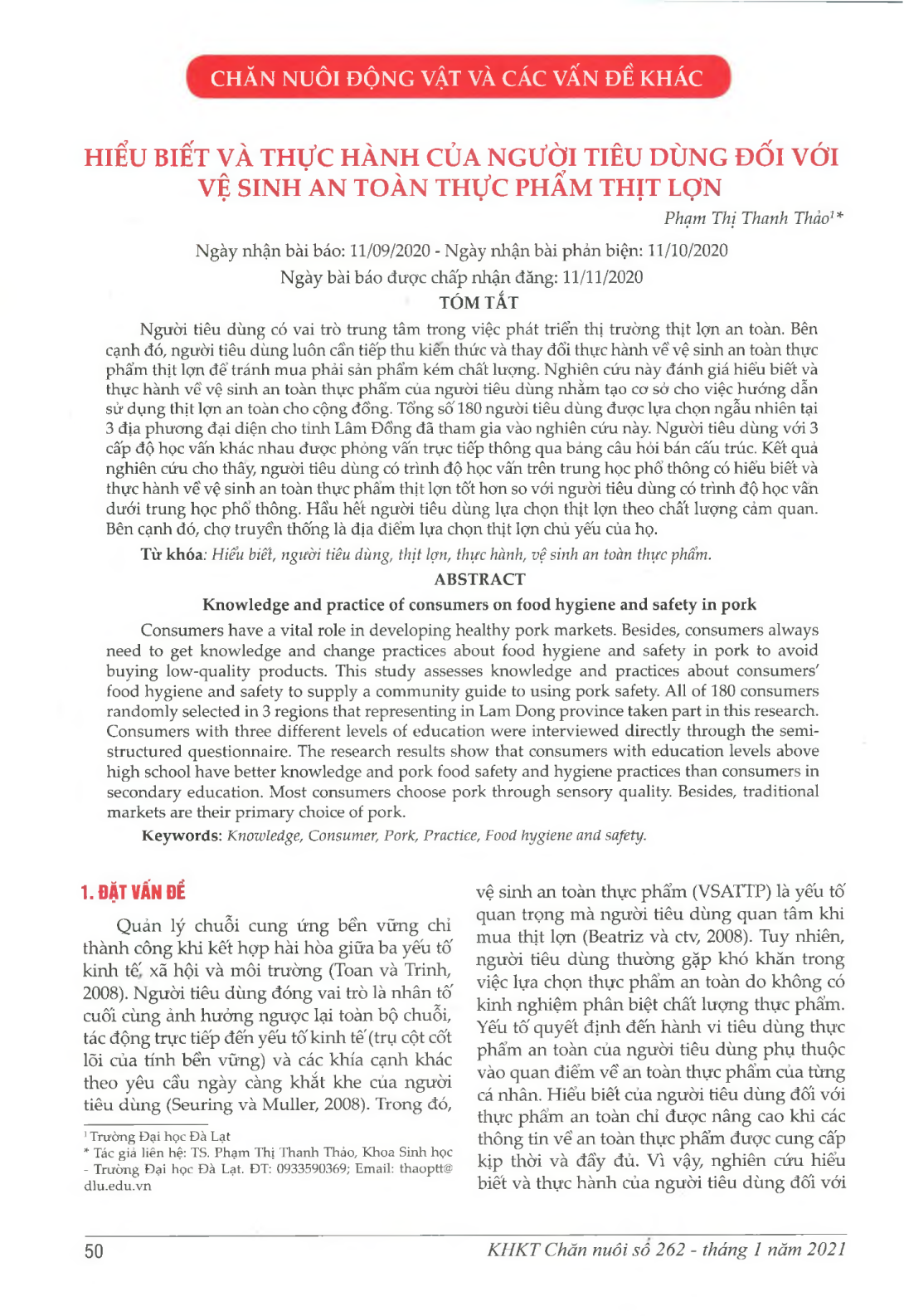 Người tiêu dùng có vai trò trung tâm trong việc phát triển thị trường thịt lợn an toàn. Bên cạnh đó, người tiêu dùng luôn cần tiếp thu kiến thức và thay đổi thực hành về vệ sinh an toàn thực phẩm thịt lợn để’ tránh mua phải sản phẩm kém chất lượng. Nghiên cứu này đánh giá hiểu biết và thực hành về vệ sinh an toàn thực phẩm của người tiêu dùng nhằm tạo cơ sở cho việc hướng dẫn sử dụng thịt lợn an toàn cho cộng đồng. Tổng số 180 người tiêu dùng được lựa chọn ngẫu nhiên tại 3 địa phương đại diện cho tỉnh Lâm Đồng đã tham gia vào nghiên cứu này. Người tiêu dùng với 3 cấp độ học vấn khác nhau được phỏng vấn trực tiếp thông qua bảng câu hỏi bán cấu trúc. Kết quả nghiên cứu cho thấy người tiêu dùng có trình độ học vấn trên trung học phổ thông có hiểu biết và thực hành về vệ sinh an toàn thực phẩm thịt lợn tốt hơn so với người tiêu dùng có trình độ học vần dưới trung học phổ thông. Hầu hết người tiêu dùng lựa chọn thịt lợn theo chất lượng cảm quan. Bên cạnh đó, chợ truyên thông là địa điểm lựa chọn thịt lợn chủ yếu của họ.