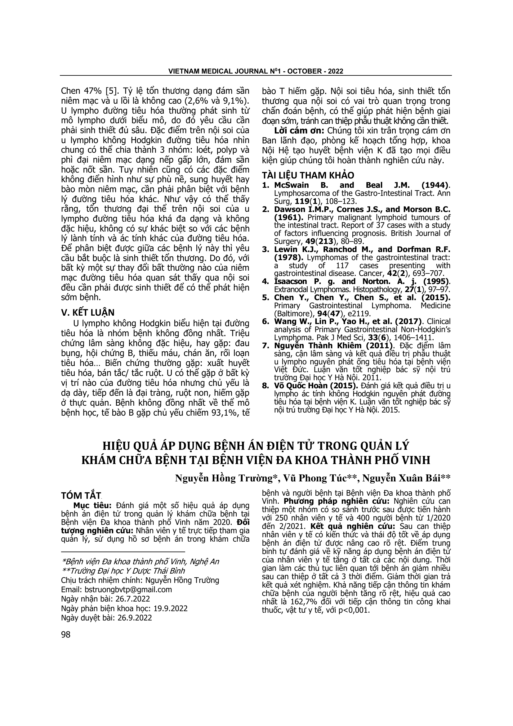 Evaluating some effects of applying electronic medical records in medical examination and treatment management at Vinh City General Hospital in 2020. Subject: Medical staff directly involved in the management and use of medical records in medical examination and treatment and patients at Vinh City General Hospital. Method: A pre-post quasi- intervention study design was conducted among 250 medical staff and 400 patients from January 2020 to February 2021. Results: After the intervention, the medical staff's knowledge and good attitude about the application of electronic medical records were significantly improved. The mean score of self- assessment of medical staff’s skills in applying electronic medical records increased in all fields. The duration to do the procedures related to the patient's medical records was greatly reduced after the intervention at all 3 periods of time. The time to return test results was reduced. Patients' ability to access medical examination and treatment information increased significantly, the possibility to access public information on drugs and medical supplies achieved the highest efficiency, at 162.7% with p<0.001.