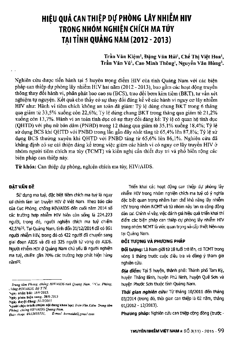 Hiệu quả can thiệp dự phòng lây nhiễm HIV trong nhóm nghiện chích ma túy tại tỉnh Quảng Nam (2012-2013)