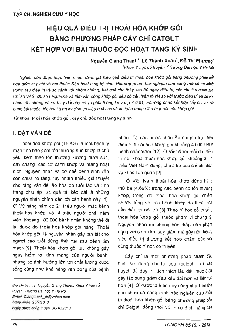 The study was to evaluate the effectiveness of treatment of knee osteoarthritis by combination catgut embedding therapy and "Doc hoat tang ky sinh" remedy. The open clinical trial compared the results before and after treatment of 60 patients with ostoarthritis. The 60 patients were divided into 2 groups. One group was treated with a combination of catgut embedding therapy and "Doc hoat tang ky sinh" and the other group was treated with the "Doc hoat tang ky sinh" alone. After 30 days of treatment, patients in both groups showed significant improvement prior treatment according to VAS indicators, Lequesne index and range of knee movement. However, those patients treated with a combination of catgut embedding therapy and "Doc hoat tang ky sinh" showed significant more improvement (p 0.01) than those treated with the "Doc hoat tang ky sinh" alone. In conclusion, the method of combining both catgut embedding therapy and "Doc hoat tang ky sinh" method is an effective and safe method in treating knee osteoarthritis.