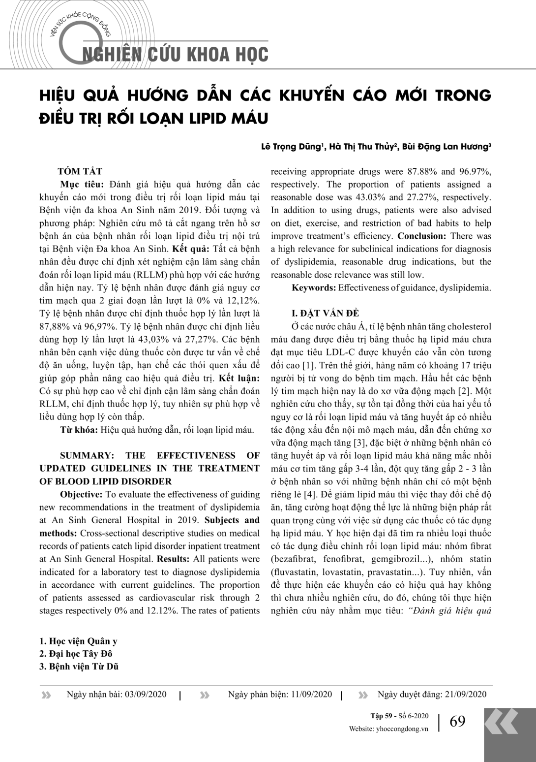 Đánh giá hiệu quả hướng dẫn các khuyến cáo mới trong điều trị rối loạn lipid máu tại Bệnh viện đa khoa An Sinh năm 2019. Nghiên cứu mô tả cắt ngang trên hồ sơ bệnh án của bệnh nhân rối loạn lipid điều trị nội trú tại Bệnh viện Đa khoa An Sinh. Kết quả Tất cả bệnh nhân đều được chỉ định xét nghiệm cận lâm sàng chẩn đoán rối loạn lipid máu (RLLM) phù hợp với các hướng dẫn hiện nay. Tỷ lệ bệnh nhân được đánh giá nguy cơ tim mạch qua 2 giai đoạn lần lượt là 0% và 12,12%. Tỷ lệ bệnh nhân được chỉ định thuốc hợp lý lần lượt là 87,88% và 96,97%. Tỷ lệ bệnh nhân được chỉ định liều dùng hợp lý lần lượt là 43,03% và 27,27%. Các bệnh nhân bên cạnh việc dùng thuốc còn được tư vấn về chế độ ăn uống, luyện tập, hạn chế các thói quen xấu để giúp góp phần nâng cao hiệu quả điều trị.
