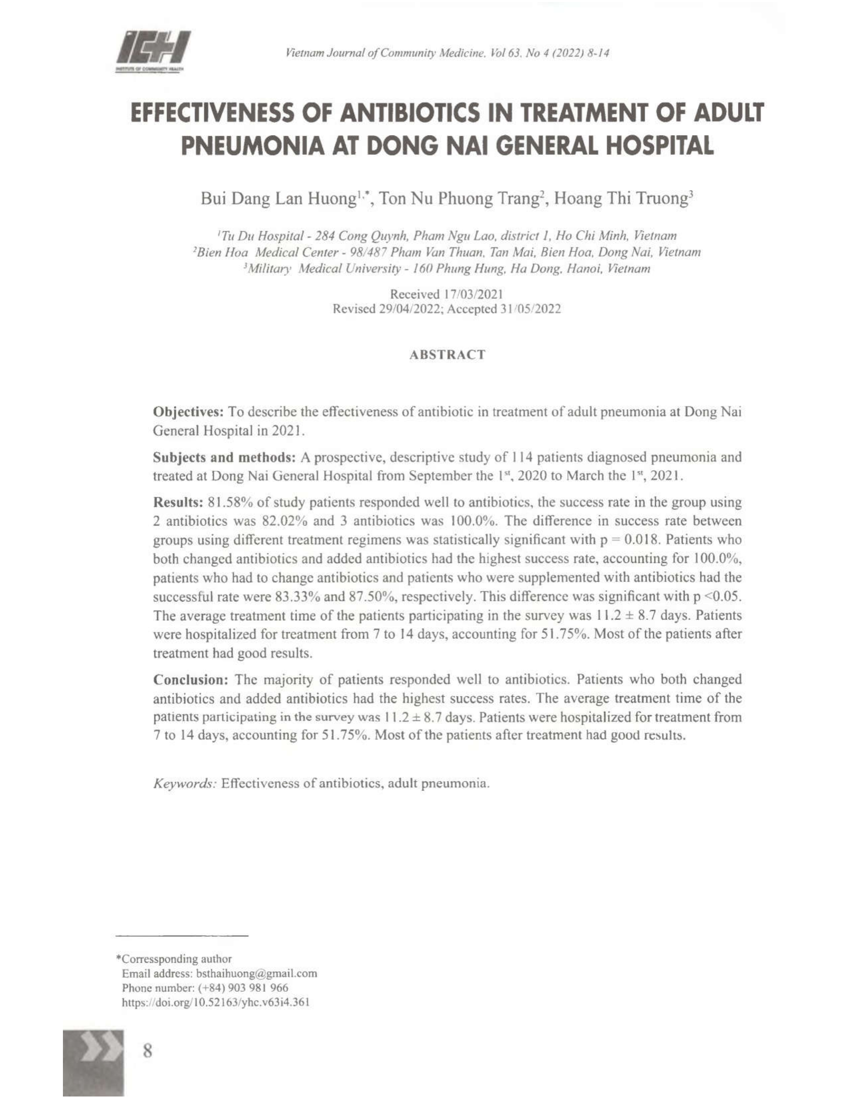 Mô tả hiệu quả sử dụng kháng sinh trong điều trị viêm phổi người lớn tại Bệnh viện Đa khoa Đồng Nai năm 2021. Đối tượng và phương pháp: Nghiên cứu tiến cứu, mô tả trên 114 bệnh nhân được chẩn đoán viêm phổi và điều trị tại Bệnh viện Đa khoa Đồng Nai - giai đoạn từ 01/9/2020 - 01/03/2021. Kết quả: Có 81,58 % bệnh nhân nghiên cứu đáp ứng tốt với kháng sinh, tỷ lệ thành công ở nhóm sử dụng 2 kháng sinh là 82,02% và 3 loại kháng sinh là 100,0%. Sự khác biệt về tỷ lệ thành công giữa các nhóm sử dụng phác đồ điều trị khác nhau là có ý nghĩa thống kê với p = 0,018. Các bệnh nhân vừa đổi loại kháng sinh vừa bổ sung kháng sinh có tỷ lệ thành công cao nhất, chiếm 100,0%, các bệnh nhân phải đổi loại kháng sinh và các bệnh nhân được bổ sung thêm kháng sinh có tỷ lệ thành công lần lượt là là 83,33% và 87,50%. Sự khác biệt này là có ý nghĩa với p < 0,05. Thời gian điều trị trung bình của các bệnh nhân tham gia khảo sát 11,2 ± 8,7 ngày. Bệnh nhân được nằm viện điều trị từ 7 đến 14 ngày chiếm tỷ lệ chủ yếu với 51,75%. Đa số các bệnh nhân sau khi điều trị đều có kết quả tốt. Kết luận: Phần lớn các bệnh nhân đáp ứng tốt với kháng sinh. Các bệnh nhân vừa đổi loại kháng sinh vừa bổ sung kháng sinh có tỷ lệ thành công cao nhất. Thời gian điều trị trung bình của các bệnh nhân tham gia khảo sát 11,2 ± 8,7 ngày. Bệnh nhân được nằm viện điều trị từ 7 đến 14 ngày chiếm tỷ lệ chủ yếu với 51,75%. Đa số các bệnh nhân sau khi điều trị đều có kết quả tốt.