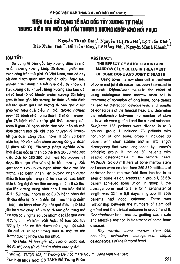 Using bone marrow stem cell in treatment of bone and joint diseases has been interested to research. Objectives: evaluate the effect of using autologous bone marrow stem cell in treatment of nonunion of long bone, bone defect caused by distraction osteogenesis and aseptic osteonecrosis of the femoral head and determine the relationship between the number of stem cells which were grafted and the clinical outcome. Subjects: 133 patients were divided in to 3 groups: group I included 73 patients with nonunion of long bone, group II included 30 patient with short stature and in limb length discrepancy that were lengthened by llizarov's principle; group III include 30 patients with aseptic osteonecrosis of the femoral head. Methods: 20-30 milliliters of bone marrow stem cell mass were created from 250-350 milliliters of aspirated bone marrow fluid then injected in to sites of bone lesion. Results: in group I, 85.6 percent patient achieved bone union; in group II, the average bone healing time for 1 centimeter of length was 32.1 + or - 5.9 days; in group III, 80 percent patients had good outcome. There was relationship between the numbers of stem cell grafted and the clinical outcome in group I and II. Conclusions: bone marrow grafting was a safe and effective method in treatment of some bone diseases.