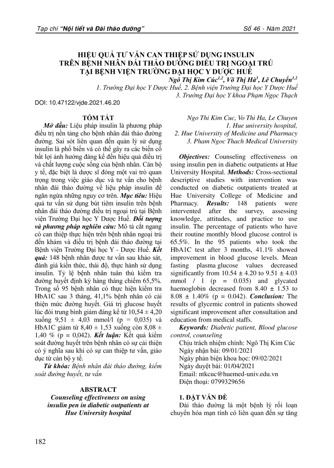 Counseling effectiveness on using insulin pen in diabetic outpatients at Hue University Hospital. Methods: Cross-sectional descriptive studies with intervention was conducted on diabetic outpatients treated at Hue University College of Medicine and Pharmacy. Results: 148 patients were intervented after the survey, assessing knowledge, attitudes, and practice to use insulin. The percentage of patients who have their routine monthly blood glucose control is 65.5%. In the 95 patients who took the HbA1C test after 3 months, 41.1% showed improvement in blood glucose levels. Mean fasting plasma glucose values decreased significantly from 10.54 ± 4.20 to 9.51 ± 4.03 mmol / l (p = 0.035) and glycated haemoglobin decreased from 8.40 ± 1.53 to 8.08 ± 1.40% (p = 0.042). Conclusion: The results of glycemic control in patients showed significant improvement after consultation and education from medical staffs.