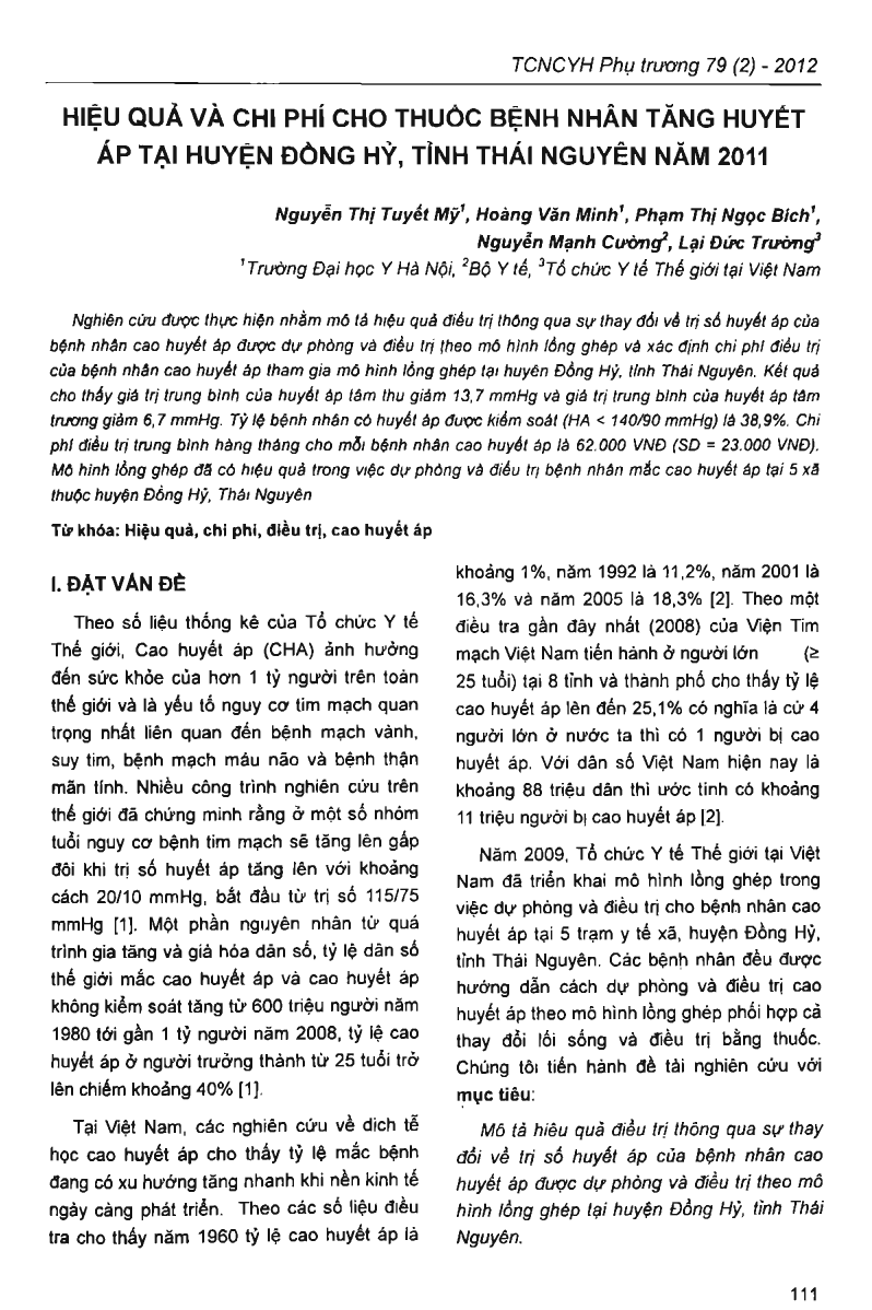 Objectives: 1) Describe the model effects through changes in blood pressure of hypertensive patients managed by the integrated model for hypertension's prevention and control in Dong Hy district, Thai Nguyen province. 2) Estimate treatment costs of hypertensive patients managed by the integrated model for hypertension prevention and control in Dong Hy district, Thai Nguyen province. Study design: study on evaluation of post-intervention. Study subject: Hypertensive patients living in 5 communes of Dong Hy, Thai Nguyen. Results: With the whole sample, the mean systolic blood pressure was reduced by 13.7 mmHg and the mean diastolic blood pressure was reduced by 6.7 mm Hg. The proportion of people whose blood pressure was under control (Blood pressure 140/90 mmHg) was 38.9 percent. The average monthly costs of drug for a hypertensive patient was VND 62,000 (sd