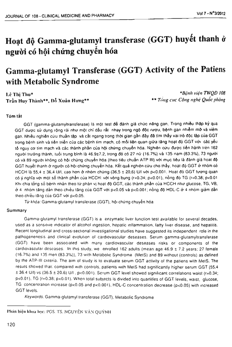 Gamma-glutamyl transferase (GGT) is a enzymatic liver function test available for several decades, used as a sensitive indicator of alcohol ingestion, hepatic inflammation, fatty liver disease, and hepatitis. Recent longitudinal and cross-sectional investigational studies have suggested its independent role in the pathogenenesis and clinical evolution of cardiovascular deseases. Serum gamma-glutamyltransferase (GGT) have been associated with many cardiovascular des eases risks or components of the cardiovascular deseases. In this study, the authors enrolled 162 adults (mean age 46.9 + or - 7.2 years; 27 female (16.7 percent) and 135 men (83.3 percent), 73 with Metabolic Syndrome (MetS) and 89 without (controls) as defined by the ATP-III criteria. The aim of study is to evaluate serum GGT activity of the patiens with MetS. The resuts showed that: compared with controls, patients with MetS had significantly higher serum GGT (55.4 + or - 36.4 U/I) vs (36.5 + or - 20.6) U/I ; p0.001). Serum GGT level showed significant correlations waist (r