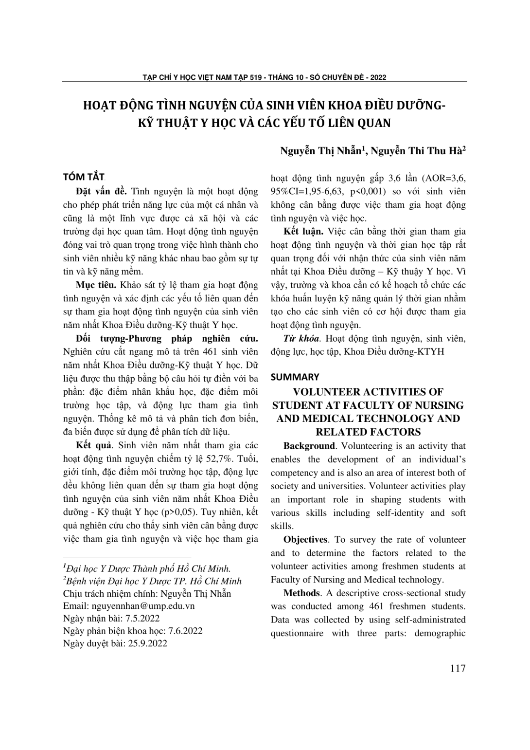 Khảo sát tỷ lệ tham gia hoạt động tình nguyện và xác định các yếu tố liên quan đến sự tham gia hoạt động tình nguyện của sinh viên năm nhất Khoa Điều dưỡng-Kỹ thuật Y học. Đối tượng-Phương pháp nghiên cứu. Nghiên cứu cắt ngang mô tả trên 461 sinh viên năm nhất Khoa Điều dưỡng-Kỹ thuật Y học. Dữ liệu được thu thập bằng bộ câu hỏi tự điền với ba phần: đặc điểm nhân khẩu học, đặc điểm môi trường học tập, và động lực tham gia tình nguyện. Thống kê mô tả và phân tích đơn biến, đa biến được sử dụng để phân tích dữ liệu. Kết quả. Sinh viên năm nhất tham gia các hoạt động tình nguyện chiếm tỷ lệ 52,7%. Tuổi, giới tính, đặc điểm môi trường học tập, động lực đều không liên quan đến sự tham gia hoạt động tình nguyện của sinh viên năm nhất Khoa Điều dưỡng - Kỹ thuật Y học (p>0,05). Tuy nhiên, kết quả nghiên cứu cho thấy sinh viên cân bằng được việc tham gia tình nguyện và việc học tham gia hoạt động tình nguyện gấp 3,6 lần (AOR=3,6, 95%CI=1,95-6,63, p<0,001) so với sinh viên không cân bằng được việc tham gia hoạt động tình nguyện và việc học. Kết luận. Việc cân bằng thời gian tham gia hoạt động tình nguyện và thời gian học tập rất quan trọng đối với nhận thức của sinh viên năm nhất tại Khoa Điều dưỡng – Kỹ thuậy Y học. Vì vậy, trường và khoa cần có kế hoạch tổ chức các khóa huấn luyện kỹ năng quản lý thời gian nhằm tạo cho các sinh viên có cơ hội được tham gia hoạt động tình nguyện.