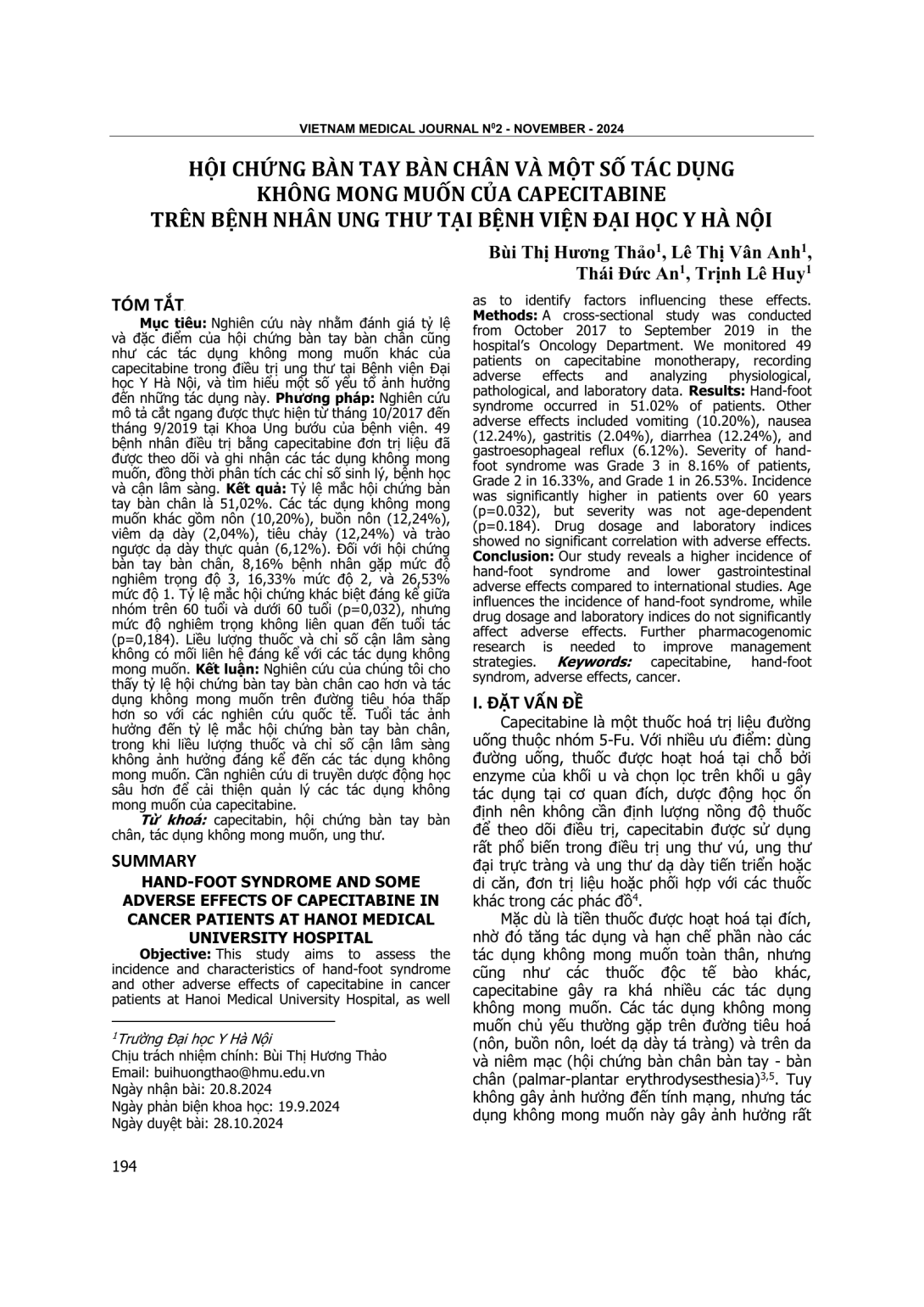 Nghiên cứu này nhằm đánh giá tỷ lệ và đặc điểm của hội chứng bàn tay bàn chân cũng như các tác dụng không mong muốn khác của capecitabine trong điều trị ung thư tại Bệnh viện Đại học Y Hà Nội, và tìm hiểu một số yếu tố ảnh hưởng đến những tác dụng này. Phương pháp: Nghiên cứu mô tả cắt ngang được thực hiện từ tháng 10/2017 đến tháng 9/2019 tại Khoa Ung bướu của bệnh viện. 49 bệnh nhân điều trị bằng capecitabine đơn trị liệu đã được theo dõi và ghi nhận các tác dụng không mong muốn, đồng thời phân tích các chỉ số sinh lý, bệnh học và cận lâm sàng. Kết quả: Tỷ lệ mắc hội chứng bàn tay bàn chân là 51,02%. Các tác dụng không mong muốn khác gồm nôn (10,20%), buồn nôn (12,24%), viêm dạ dày (2,04%), tiêu chảy (12,24%) và trào ngược dạ dày thực quản (6,12%). Đối với hội chứng bàn tay bàn chân, 8,16% bệnh nhân gặp mức độ nghiêm trọng độ 3, 16,33% mức độ 2, và 26,53% mức độ 1. Tỷ lệ mắc hội chứng khác biệt đáng kể giữa nhóm trên 60 tuổi và dưới 60 tuổi (p=0,032), nhưng mức độ nghiêm trọng không liên quan đến tuổi tác (p=0,184). Liều lượng thuốc và chỉ số cận lâm sàng không có mối liên hệ đáng kể với các tác dụng không mong muốn. Kết luận: Nghiên cứu của chúng tôi cho thấy tỷ lệ hội chứng bàn tay bàn chân cao hơn và tác dụng không mong muốn trên đường tiêu hóa thấp hơn so với các nghiên cứu quốc tế. Tuổi tác ảnh hưởng đến tỷ lệ mắc hội chứng bàn tay bàn chân, trong khi liều lượng thuốc và chỉ số cận lâm sàng không ảnh hưởng đáng kể đến các tác dụng không mong muốn. Cần nghiên cứu di truyền dược động học sâu hơn để cải thiện quản lý các tác dụng không mong muốn của capecitabine.