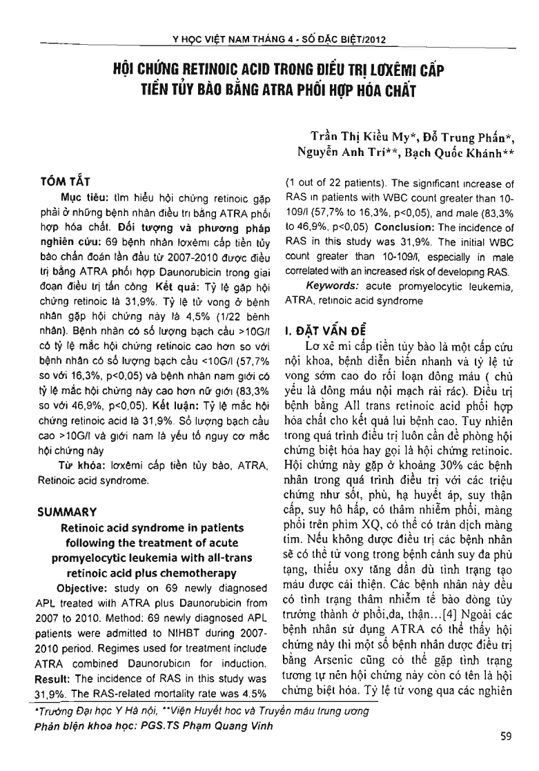 Objective: study on 69 newly diagnosed APL treated with ATRA plus Daunorubicin from 2007 to 2010. Method: 69 newly diagnosed APL patients were admitted to NIHBT during 20072010 period. Regimes used for treatment include ATRA combined Daunorubicin for induction. Result: The incidence of RAS in this study was 31.9 percent. The RAS-related mortality rate was 4.5 percent (1 out of 22 patients). The significant increase of RAS in patients with WBC count greater than 10-109/1 (57.7 percent to 16.3 percent, p0.05), and male (83.3 percent to 46.9 percent, p0,05). Conclusion: The incidence of RAS in this study was 31.9 percent. The initial WBC count greater than 10-109/1, especially in male correlated with an increased risk of developing RAS.