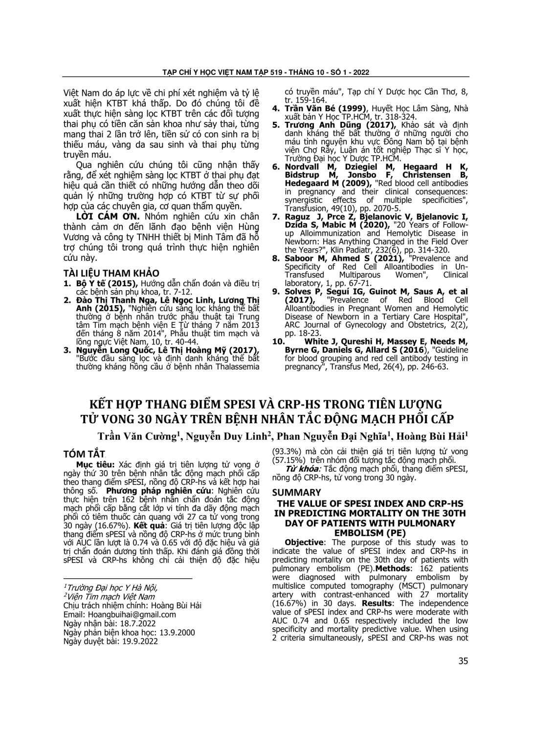 Xác định giá trị tiên lượng tử vong ở ngày thứ 30 trên bệnh nhân tắc động mạch phổi cấp theo thang điểm sPESI, nồng độ CRP-hs và kết hợp hai thông số. Phương pháp nghiên cứu: Nghiên cứu thực hiện trên 162 bệnh nhân chẩn đoán tắc động mạch phổi cấp bằng cắt lớp vi tính đa dãy động mạch phổi có tiêm thuốc cản quang với 27 ca tử vong trong 30 ngày (16.67%). Kết quả: Giá trị tiên lượng độc lập thang điểm sPESI và nồng độ CRP-hs ở mức trung bình với AUC lần lượt là 0.74 và 0.65 với độ đặc hiệu và giá trị chẩn đoán dương tính thấp. Khi đánh giá đồng thời sPESI và CRP-hs không chỉ cải thiện độ đặc hiệu Xác định giá trị tiên lượng tử vong ở ngày thứ 30 trên bệnh nhân tắc động mạch phổi cấp theo thang điểm sPESI, nồng độ CRP-hs và kết hợp hai thông số. Phương pháp nghiên cứu: Nghiên cứu thực hiện trên 162 bệnh nhân chẩn đoán tắc động mạch phổi cấp bằng cắt lớp vi tính đa dãy động mạch phổi có tiêm thuốc cản quang với 27 ca tử vong trong 30 ngày (16.67%). Kết quả: Giá trị tiên lượng độc lập thang điểm sPESI và nồng độ CRP-hs ở mức trung bình với AUC lần lượt là 0.74 và 0.65 với độ đặc hiệu và giá trị chẩn đoán dương tính thấp. Khi đánh giá đồng thời sPESI và CRP-hs không chỉ cải thiện độ đặc hiệu