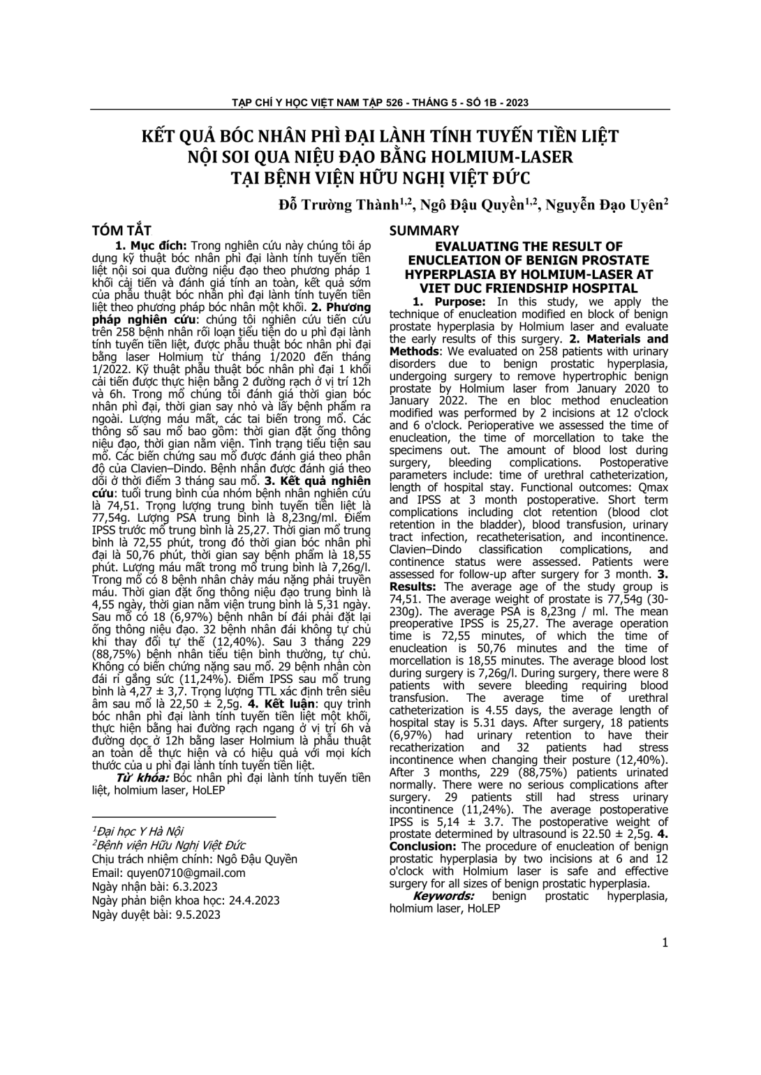 Trong nghiên cứu này chúng tôi áp dụng kỹ thuật bóc nhân phì đại lành tính tuyến tiền liệt nội soi qua đường niệu đạo theo phương pháp 1 khối cải tiến và đánh giá tính an toàn, kết quả sớm của phẫu thuật bóc nhân phì đại lành tính tuyến tiền liệt theo phương pháp bóc nhân một khối. Phương pháp nghiên cứu: chúng tôi nghiên cứu tiến cứu trên 258 bệnh nhân rối loạn tiểu tiện do u phì đại lành tính tuyến tiền liệt, được phẫu thuật bóc nhân phì đại bằng laser Holmium từ tháng 1/2020 đến tháng 1/2022. Kỹ thuật phẫu thuật bóc nhân phì đại 1 khối cải tiến được thực hiện bằng 2 đường rạch ở vị trí 12h và 6h. Trong mổ chúng tôi đánh giá thời gian bóc nhân phì đại, thời gian say nhỏ và lấy bệnh phẩm ra ngoài. Lượng máu mất, các tai biến trong mổ. Các thông số sau mổ bao gồm: thời gian đặt ống thông niệu đạo, thời gian nằm viện. Tình trạng tiểu tiện sau mổ. Các biến chứng sau mổ được đánh giá theo phân độ của Clavien–Dindo. Bệnh nhân được đánh giá theo dõi ở thời điểm 3 tháng sau mổ. Kết quả nghiên cứu: tuổi trung bình của nhóm bệnh nhân nghiên cứu là 74,51. Trọng lượng trung bình tuyến tiền liệt là 77,54g. Lượng PSA trung bình là 8,23ng/ml. Điểm IPSS trước mổ trung bình là 25,27. Thời gian mổ trung bình là 72,55 phút, trong đó thời gian bóc nhân phì đại là 50,76 phút, thời gian say bệnh phẩm là 18,55 phút. Lượng máu mất trong mổ trung bình là 7,26g/l. Trong mổ có 8 bệnh nhân chảy máu nặng phải truyền máu. Thời gian đặt ống thông niệu đạo trung bình là 4,55 ngày, thời gian nằm viện trung bình là 5,31 ngày. Sau mổ có 18 (6,97%) bệnh nhân bí đái phải đặt lại ống thông niệu đạo. 32 bệnh nhân đái không tự chủ khi thay đổi tự thế (12,40%). Sau 3 tháng 229 (88,75%) bệnh nhân tiểu tiện bình thường, tự chủ. Không có biến chứng nặng sau mổ. 29 bệnh nhân còn đái rỉ gắng sức (11,24%). Điểm IPSS sau mổ trung bình là 4,27 ± 3,7. Trọng lượng TTL xác định trên siêu âm sau mổ là 22,50 ± 2,5g. Kết luận: quy trình bóc nhân phì đại lành tính tuyến tiền liệt một khối, thực hiện bằng hai đường rạch ngang ở vị trí 6h và đường dọc ở 12h bằng laser Holmium là phẫu thuật an toàn dễ thực hiện và có hiệu quả với mọi kích thước của u phì đại lành tính tuyến tiền liệt.