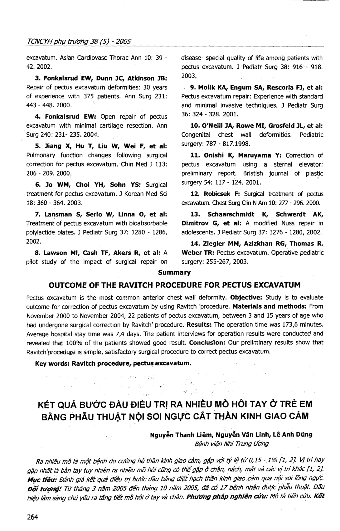 Đánh giá kết quả điều trị bệnh ra mồ hôi tay bằng phẫu thuật thần kinh giao cảm qua nội soi lồng ngực cho 17 bệnh nhi. Không có bệnh nhân nào bị tử vong trong và sau mổ, biến chứng tràn dịch màng phổi gặp ở 1 trường hợp. Tất cả BN đều hết mồ hôi tay sau mổ. Thời gian nằm viênh trung bình là 2,3 ngày. Như vậy đây là phương pháp điều trị an toàn và có hiệu quả cao.