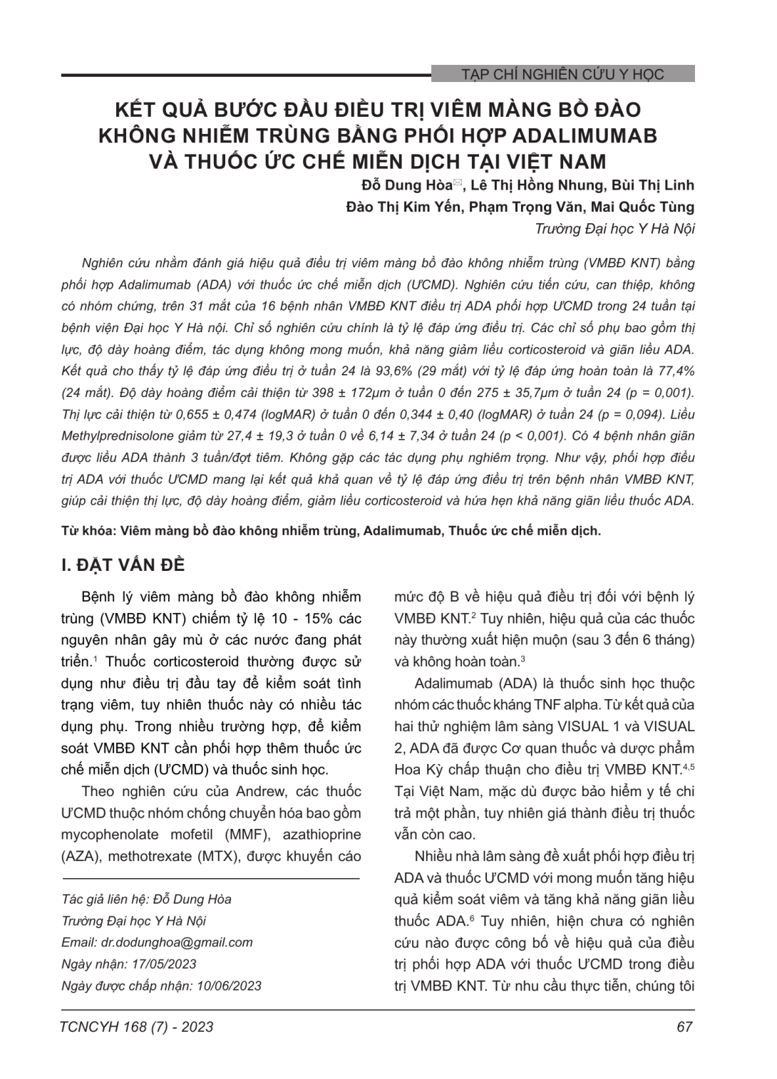 Nghiên cứu nhằm đánh giá hiệu quả điều trị viêm màng bồ đào không nhiễm trùng (VMBĐ KNT) bằng phối hợp Adalimumab (ADA) với thuốc ức chế miễn dịch (ƯCMD). Nghiên cứu tiến cứu, can thiệp, không có nhóm chứng, trên 31 mắt của 16 bệnh nhân VMBĐ KNT điều trị ADA phối hợp ƯCMD trong 24 tuần tại bệnh viện Đại học Y Hà nội. Chỉ số nghiên cứu chính là tỷ lệ đáp ứng điều trị. Các chỉ số phụ bao gồm thị lực, độ dày hoàng điểm, tác dụng không mong muốn, khả năng giảm liều corticosteroid và giãn liều ADA. Kết quả cho thấy tỷ lệ đáp ứng điều trị ở tuần 24 là 93,6% (29 mắt) với tỷ lệ đáp ứng hoàn toàn là 77,4% (24 mắt). Độ dày hoàng điểm cải thiện từ 398 ± 172μm ở tuần 0 đến 275 ± 35,7μm ở tuần 24 (p = 0,001). Thị lực cải thiện từ 0,655 ± 0,474 (logMAR) ở tuần 0 đến 0,344 ± 0,40 (logMAR) ở tuần 24 (p = 0,094). Liều Methylprednisolone giảm từ 27,4 ± 19,3 ở tuần 0 về 6,14 ± 7,34 ở tuần 24 (p < 0,001). Có 4 bệnh nhân giãn được liều ADA thành 3 tuần/đợt tiêm. Không gặp các tác dụng phụ nghiêm trọng. Như vậy, phối hợp điều trị ADA với thuốc ƯCMD mang lại kết quả khả quan về tỷ lệ đáp ứng điều trị trên bệnh nhân VMBĐ KNT, giúp cải thiện thị lực, độ dày hoàng điểm, giảm liều corticosteroid và hứa hẹn khả năng giãn liều thuốc ADA.