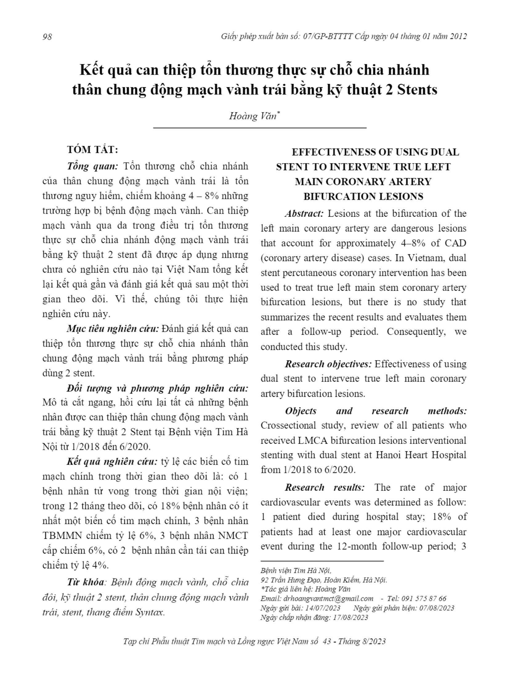 Effectiveness of using dual stent to intervene true left main coronary artery bifurcation lesions. Objects and research methods: Crossectional study, review of all patients who received LMCA bifurcation lesions interventional stenting with dual stent at Hanoi Heart Hospital from 1/2018 to 6/2020. Research results: The rate of major cardiovascular events was determined as follow: 1 patient died during hospital stay; 18% of patients had at least one major cardiovascular event during the 12-month follow-up period; 3 patients had cerebrovascular accidents, which accounted for 6%; 3 patients had acute myocardial infarction, which accounted for 6%; and 2 patients had acute myocardial infarction, which accounted for 6%. Two patients require revascularization, representing 4% of the total population.