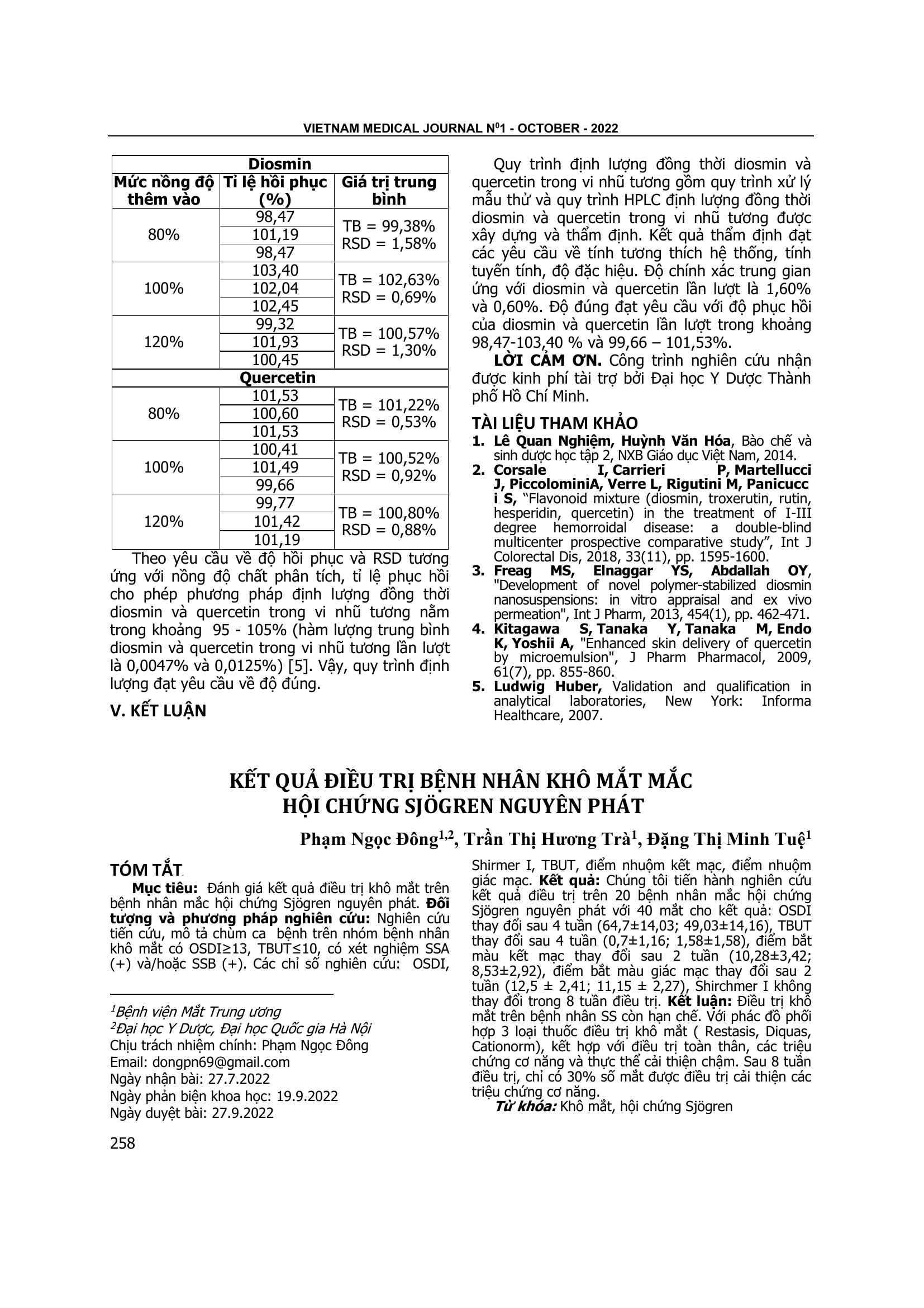 Đánh giá kết quả điều trị khô mắt trên bệnh nhân mắc hội chứng Sjögren nguyên phát. Đối tượng và phương pháp nghiên cứu: Nghiên cứu tiến cứu, mô tả chùm ca bệnh trên nhóm bệnh nhân khô mắt có OSDI≥13, TBUT≤10, có xét nghiệm SSA (+) và/hoặc SSB (+). Các chỉ số nghiên cứu: OSDI, Shirmer I, TBUT, điểm nhuộm kết mạc, điểm nhuộm giác mạc. Kết quả: Chúng tôi tiến hành nghiên cứu kết quả điều trị trên 20 bệnh nhân mắc hội chứng Sjögren nguyên phát với 40 mắt cho kết quả: OSDI thay đổi sau 4 tuần (64,7±14,03; 49,03±14,16), TBUT thay đổi sau 4 tuần (0,7±1,16; 1,58±1,58), điểm bắt màu kết mạc thay đổi sau 2 tuần (10,28±3,42; 8,53±2,92), điểm bắt màu giác mạc thay đổi sau 2 tuần (12,5 ± 2,41; 11,15 ± 2,27), Shirchmer I không thay đổi trong 8 tuần điều trị. Kết luận: Điều trị khô mắt trên bệnh nhân SS còn hạn chế. Với phác đồ phối hợp 3 loại thuốc điều trị khô mắt ( Restasis, Diquas, Cationorm), kết hợp với điều trị toàn thân, các triệu chứng cơ năng và thực thể cải thiện chậm. Sau 8 tuần điều trị, chỉ có 30% số mắt được điều trị cải thiện các triệu chứng cơ năng.