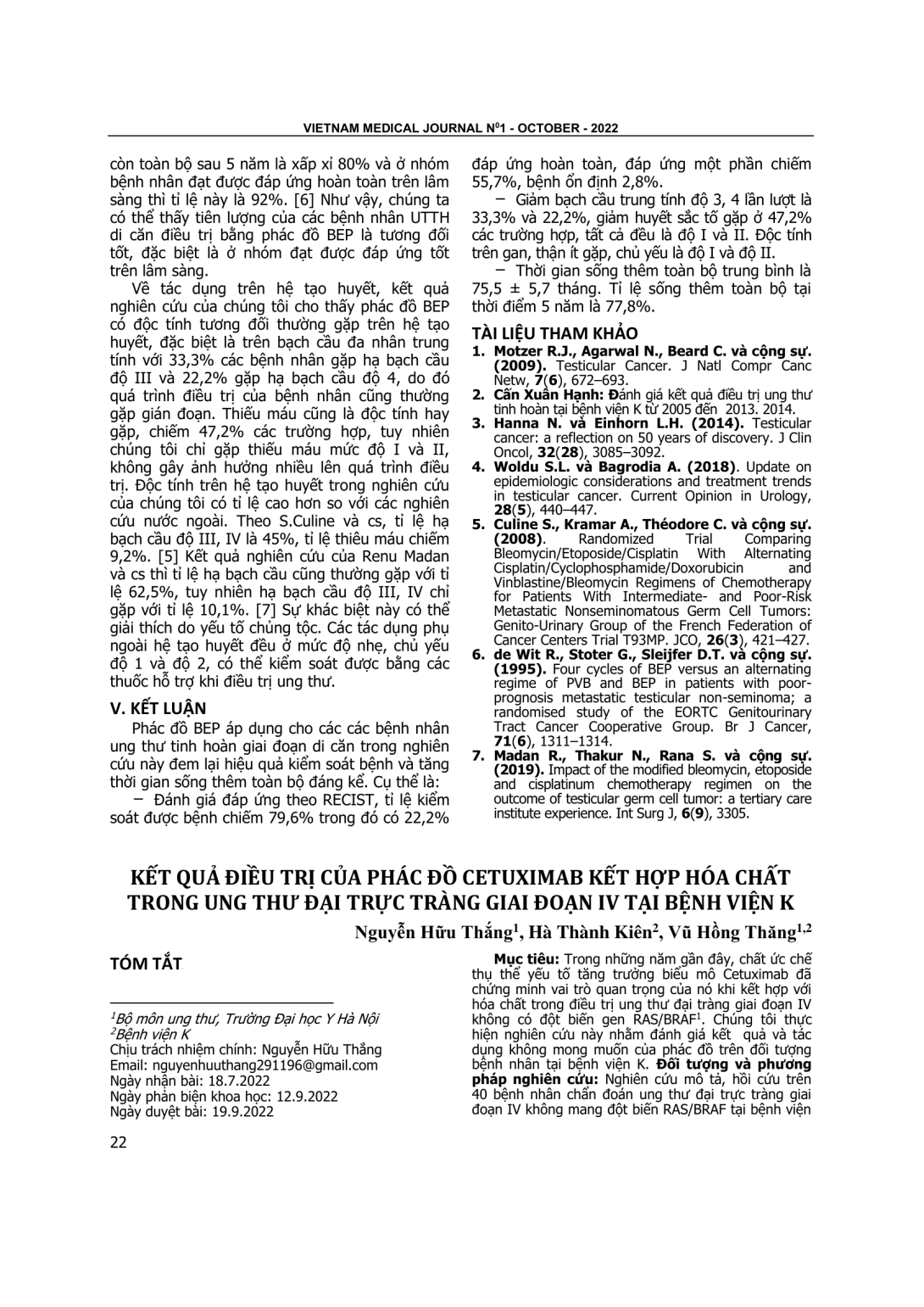 In recent years, the epithelial growth factor receptor inhibitor Cetuximab has demonstrated its important role in the combination with chemotherapy in the treatment of RAS/BRAF wild-type stage IV colon cancer. We carried out this study to evaluate the efficacy and adverse events of the regimen at K hospital. Subjects and methods: This is a descriptive study on 40 patients diagnosed with stage IV colorectal cancer without RAS/BRAF mutations at K hospital from July 2017 to August 2022 that were treated with Cetuximab combined with chemotherapy regimens of mFOLFOX6 or mFOLFIRI. Results: Overall response rate (ORR) was 57.5%, median progression-free survival (PFS) was 12.0 months, median overall survival (OS) was 31.0 months. The most common side effects are diarrhea (60%), increased liver enzymes (50%) and acne-form dermatitis (40%), mainly in grade 1 and 2 with the rate of 55%, 47.5% and 25% respectively; no serious adverse events were noted. Conclusion: Cetuximab combined with chemotherapy resulted in high response rate, long progression-free and overall survival and was well tolerated by patients.