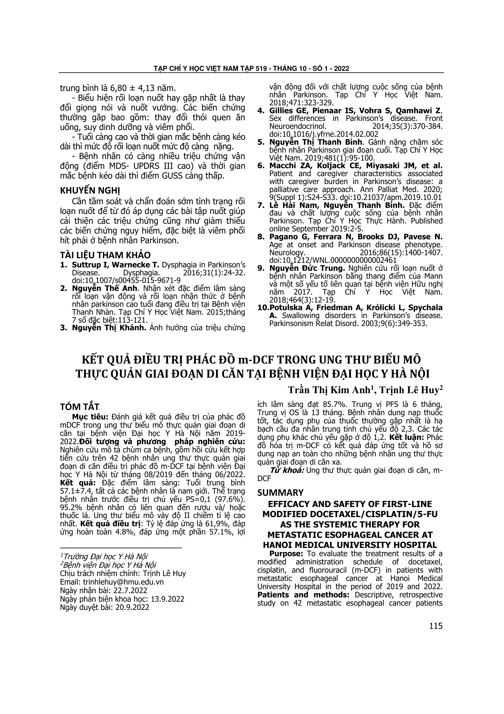 Đánh giá kết quả điều trị của phác đồ mDCF trong ung thư biểu mô thực quản giai đoạn di căn tại bệnh viện Đại học Y Hà Nội năm 2019- 2022.Đối tượng và phương pháp nghiên cứu: Nghiên cứu mô tả chùm ca bệnh, gồm hồi cứu kết hợp tiến cứu trên 42 bệnh nhân ung thư thực quản giai đoạn di căn điều trị phác đồ m-DCF tại bệnh viện Đại học Y Hà Nội từ tháng 08/2019 đến tháng 06/2022. Đặc điểm lâm sàng: Tuổi trung bình 57.1±7.4, tất cả các bệnh nhân là nam giới. Thể trạng bệnh nhân trước điều trị chủ yếu PS=0,1 (97.6%). 95.2% bệnh nhân có liên quan đến rượu và/ hoặc thuốc lá. Ung thư biểu mô vảy độ II chiếm tỉ lệ cao nhất. Kết quả điều trị: Tỷ lệ đáp ứng là 61,9%, đáp ứng hoàn toàn 4.8%, đáp ứng một phần 57.1%, lợi ích lâm sàng đạt 85.7%. Trung vị PFS là 6 tháng, Trung vị OS là 13 tháng. Bệnh nhân dung nạp thuốc tốt, tác dụng phụ của thuốc thường gặp nhất là hạ bạch cầu đa nhân trung tính chủ yếu độ 2,3. Các tác dụng phụ khác chủ yếu gặp ở độ 1,2. Kết luận: Phác đồ hóa trị m-DCF có kết quả đáp ứng tốt và hồ sơ dung nạp an toàn cho những bệnh nhân ung thư thực quản giai đoạn di căn xa