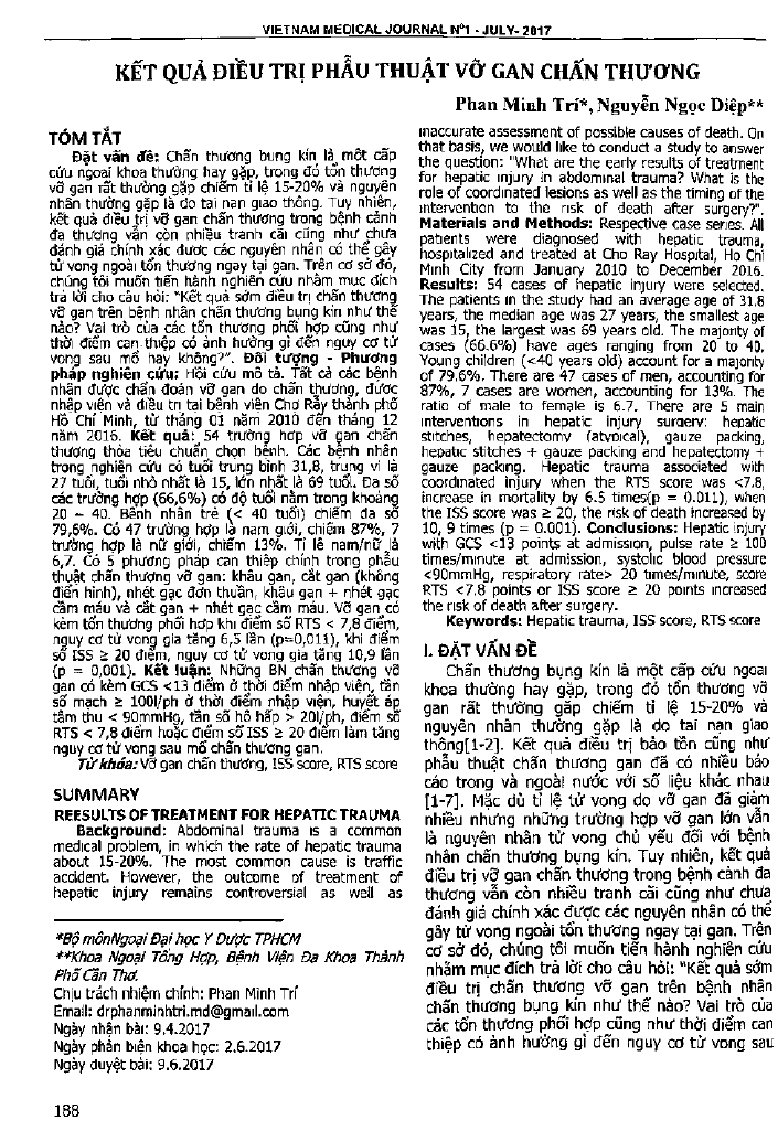 Đánh giá kết quả điều trị phẫu thuật vỡ gan chấn thương tại bệnh viện Chợ Rẫy từ 01/2010 đến 12/2016. Kết quả cho thấy những bệnh nhân chấn thương vỡ gan có kèm GCS dưới 13 điểm ở thời điểm nhập viện, tần số mạch lớn hơn 100 l/ph ở thời điểm nhập viện, huyết áp tâm thu dưới 90 mmHg, tần số hô hấp trên 20 l/ph, điểm số RTS dưới 7,8 điểm hoặc điểm số ISS trên 20 điểm làm tăng nguy cơ tử vong sau mổ chấn thương gan.