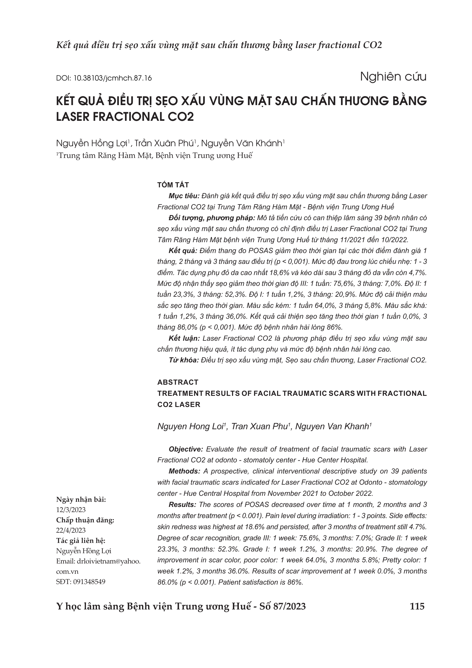 Evaluate the result of treatment of facial traumatic scars with Laser Fractional CO2 at odonto - stomatoly center - Hue Center Hospital. Methods: A prospective, clinical interventional descriptive study on 39 patients with facial traumatic scars indicated for Laser Fractional CO2 at Odonto - stomatology center - Hue Central Hospital from November 2021 to October 2022. Results: The scores of POSAS decreased over time at 1 month, 2 months and 3 months after treatment (p < 0.001). Pain level during irradiation: 1 - 3 points. Side effects: skin redness was highest at 18.6% and persisted, after 3 months of treatment still 4.7%. Degree of scar recognition, grade III: 1 week: 75.6%, 3 months: 7.0%; Grade II: 1 week 23.3%, 3 months: 52.3%. Grade I: 1 week 1.2%, 3 months: 20.9%. The degree of improvement in scar color, poor color: 1 week 64.0%, 3 months 5.8%; Pretty color: 1 week 1.2%, 3 months 36.0%. Results of scar improvement at 1 week 0.0%, 3 months 86.0% (p < 0.001). Patient satisfaction is 86%. Conclusion: Laser Fractional CO2 is an effective therapy for facial tramatic scars, with minimal side effects and high level of patient satisfaction.