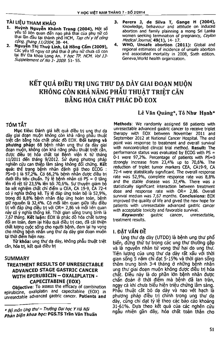 Objective: To assess the efficacy of combination epirubicine, oxaliplatin and capecitabine (EOX) in unresectable advanced gastric cancer. Patients and Methods: the authors randomly assigned 68 patients with unresectable advanced gastric cancer to receive triplet therapy with EOX between November 2011 and September 2012 at National Cancer Hospital. The end point was response to treatment and overall survival with noncontrolled clinical trial method. Result: The performance status was evaluated by ECOG with PS = 0-1 were 97,2 percent. Percentage of patients with PS=O strongly increase from 23,4 percent up to 70,6 percent. The reduction of triplet tumor markers CEA, CA19-9, CA 72-4 were statistically significant. The overall response rate was 52,9 percent, complete response rate was 8,8 percent and the stable disease was 32,4 percent. There was a statistically significant interaction between treatment dose and response rate witfl OR= 2,86. Overall survival median was 7,67 months. Conclusions: EOX improved the quality of life and gived the new hope for patients with unresectable advanced gastric cancer with acceptable toxicity and favqrable survival.