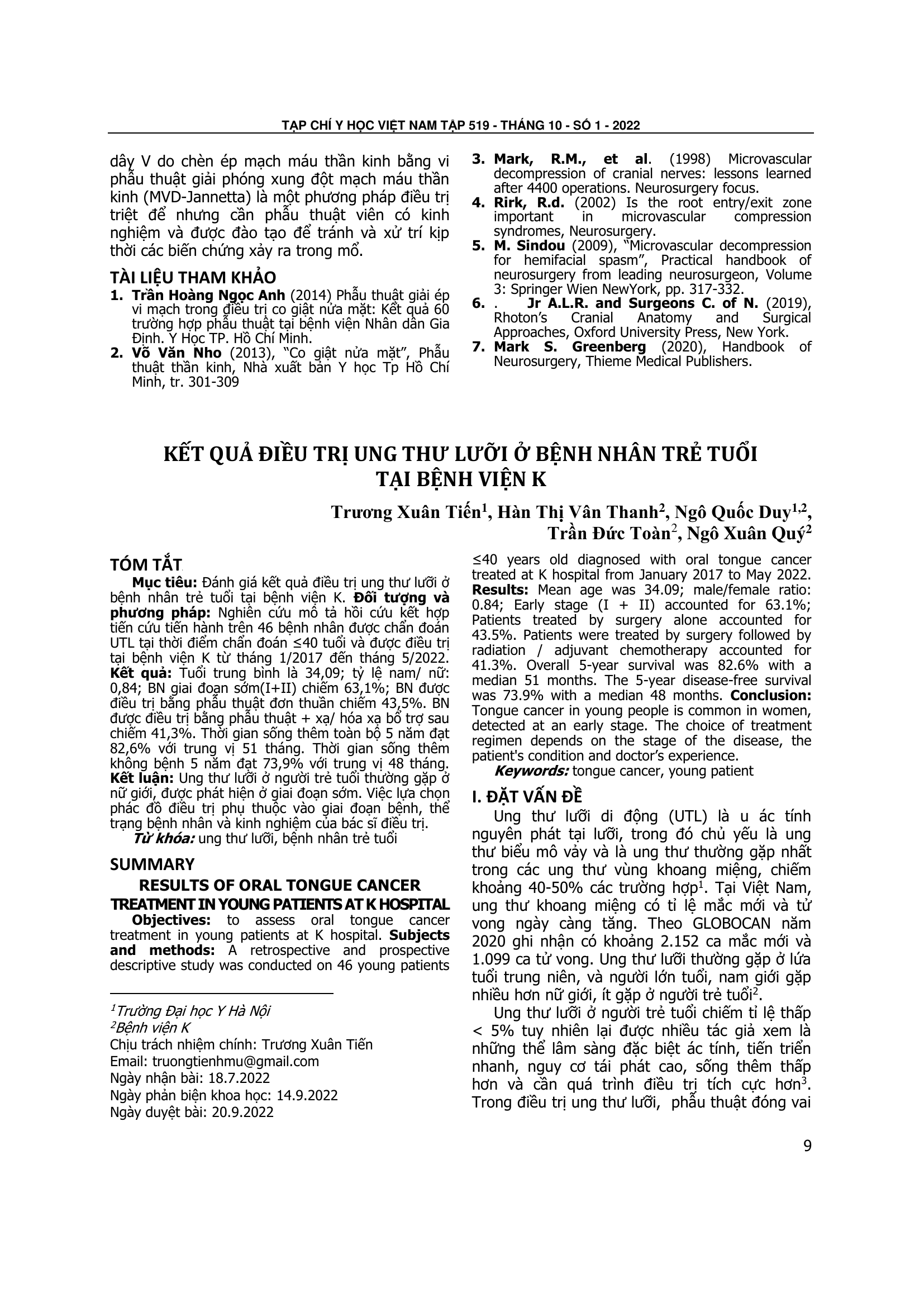Đánh giá kết quả điều trị ung thư lưỡi ở bệnh nhân trẻ tuổi tại bệnh viện K. Đối tượng và phương pháp: Nghiên cứu mô tả hồi cứu kết hợp tiến cứu tiến hành trên 46 bệnh nhân được chẩn đoán UTL tại thời điểm chẩn đoán ≤40 tuổi và được điều trị tại bệnh viện K từ tháng 1/2017 đến tháng 5/2022. Tuổi trung bình là 34,09; tỷ lệ nam/ nữ: 0,84; BN giai đoạn sớm(I+II) chiếm 63,1%; BN được điều trị bằng phẫu thuật đơn thuần chiếm 43,5%. BN được điều trị bằng phẫu thuật + xạ/ hóa xạ bổ trợ sau chiếm 41,3%. Thời gian sống thêm toàn bộ 5 năm đạt 82,6% với trung vị 51 tháng. Thời gian sống thêm không bệnh 5 năm. Ung thư lưỡi ở người trẻ tuổi thường gặp ở nữ giới, được phát hiện ở giai đoạn sớm. Việc lựa chọn phác đồ điều trị phụ thuộc vào giai đoạn bệnh, thể trạng bệnh nhân và kinh nghiệm của bác sĩ điều trị.