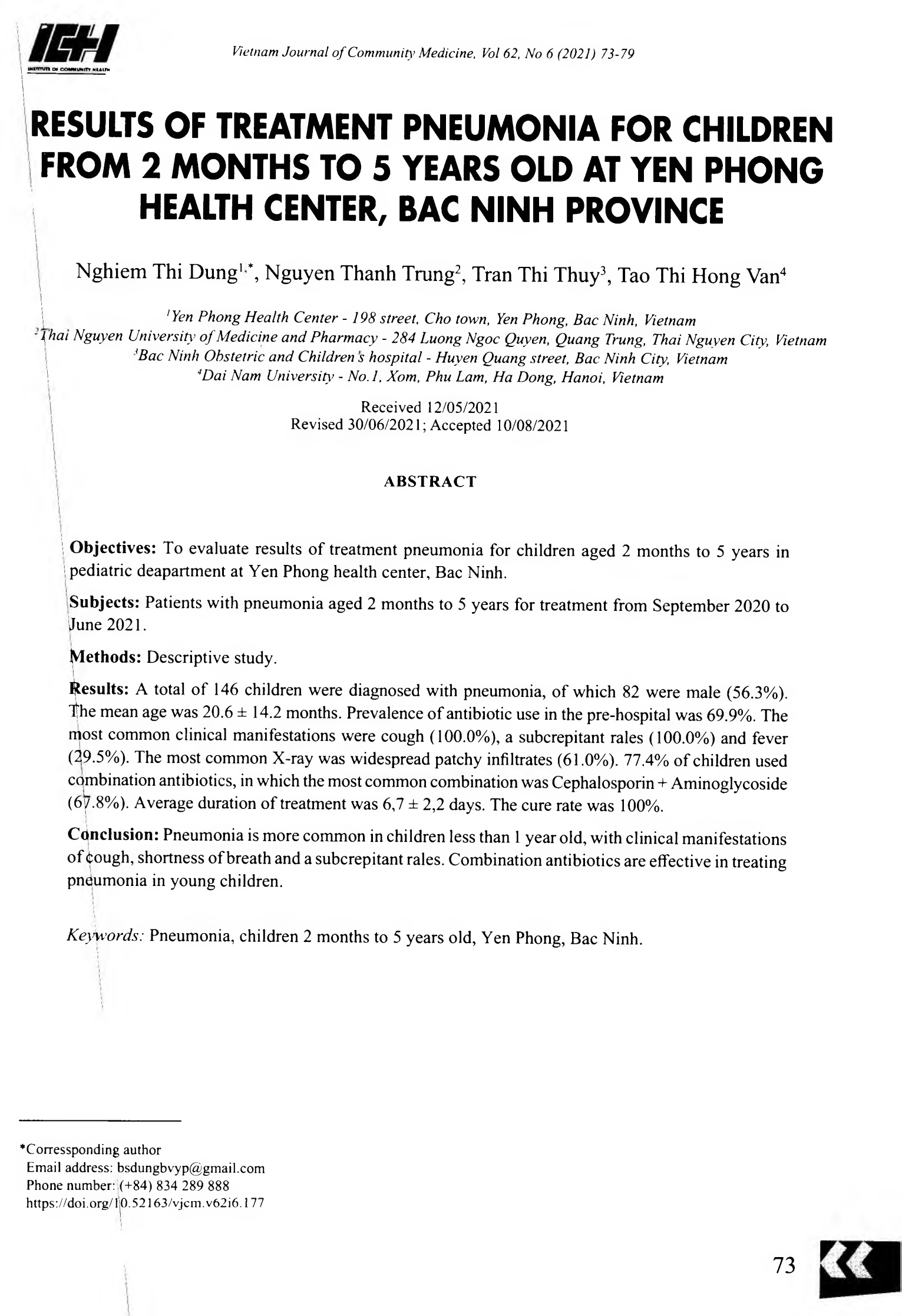 Đánh giá kết quả điều trị viêm phổi ở trẻ 2 tháng đến 5 tuổi tại Trung tâm Y tế huyện Yên Phong, Bắc Ninh. Bệnh nhân 2 tháng đến 5 tuổi bị viêm phổi vào điều trị từ 09/2020 đến tháng 06/2021. 146 trẻ được chẩn đoán viêm phổi, trong đó có 82 trẻ nam chiếm 56,3%. Tuổi trung bình là 20,6 ± 14,2 tháng. Có 69,9% trẻ được dùng kháng sinh trước vào viện. Triệu chứng lâm sàng gặp nhiều nhất là ho (100%), sốt (29,5%). 100% bệnh nhân nghe phổi có ran ẩm nhỏ hạt, 2,1% có tím. Trên Xquang dạng nốt mờ rải rác chiếm 61,0%. Tỉ lệ tăng bạch cầu là 76,0% và 82,9% tăng bạch cầu đa nhân trung tính. Có 42,5% bệnh nhân có tăng CRP. 77,4% trẻ được sử dụng kháng sinh phối hợp. Phối hợp Cephalosporin và Aminoglycosid chiếm 67,8%. Thời gian điều trị trung bình là 6,7 ± 2,2 ngày. Tỉ lệ khỏi bệnh sau điều trị là 100%. Biểu hiện lâm sàng chủ yếu là ho, thở nhanh, ran ẩm nhỏ hạt. Sử dụng kháng sinh phối hợp có hiệu quả trong điều trị viêm phổi ở trẻ nhỏ.