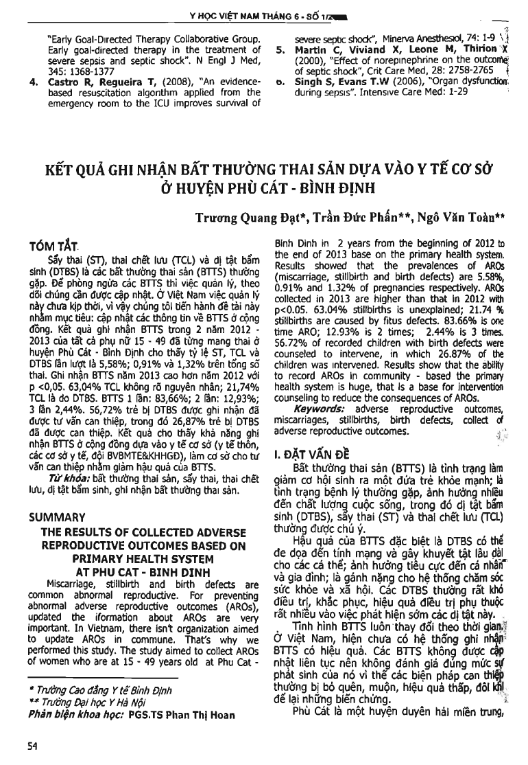 Miscarriage, stillbirth and birth defects are common abnormal reproductive. For preventing abnormal adverse reproductive outcomes (AROs), updated the iformation about AROs are very important. In Vietnam, there isn't organization aimed to update AROs in commune. That's why the authors performed this study. The study aimed to collect AROs of women who are at 15-49 years old at Phu Cat - Binh Dinh in 2 years from the beginning of 2012 to the end of 2013 base on the primary health system. Results showed that the prevalences of AROs (miscarriage, stillbirth and birth defects) are 5.58 percent, 0.91 percent and 1.32 percent of pregnancies respectively. AROs collected in 2013 are higher than that in 2012 with p0.05. 63.04 percent stillbirths is unexplained; 21.74 percent stillbirths are caused by fitus defects. 83.66 percent is one time ARO; 12.93 percent is 2 times; 2.44 percent is 3 times. 56.72 percent of recorded children with birth defects were counseled to intervene, in which 26.87 percent of the children was intervened. Results show that the ability to record AROs in community - based the primary health system is huge, that is a base for intervention counseling to reduce the consequences of AROs.