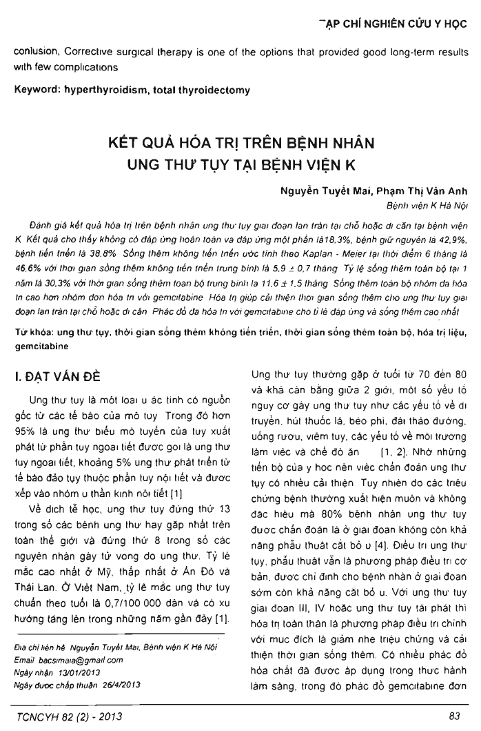 The purpose of this study is to evaluate the efficacy of chemotherapy in patients with locally advanced or metastatic pancreatic cancer. Results: the authors found that none of the patients showed a complete response after ... months of chemotherapy. However, about 18.3 percent of the patients exhibited partial responses. After treatment, 42.9 percent of the patients were stable, and progressive diseass were observed in 38.8 percent of the patients. At 6 months of treatment, 46.6 percent exhibited progression-free disease (PFS). The median progression-free survival was 5.9 + 1.5 months. At 1 year post chemotherapy, the overal survival rate was 30.9 percent with a median survival was 11.6 + or - 1.5 months. Gemcitabine-chemotherapy combination treatment was more superior than Gemcitabine alone in increasing the overall survival rate of locally advanced or metastatic pancreatic cancer patients. Conclusion: Chemotherapy treatment in combinantion with Gemcitabine is a better therapy than treatment with Gemcitabine alone in improving the survival rates of patients with locally advanced or metastatic pancreatic cancer.