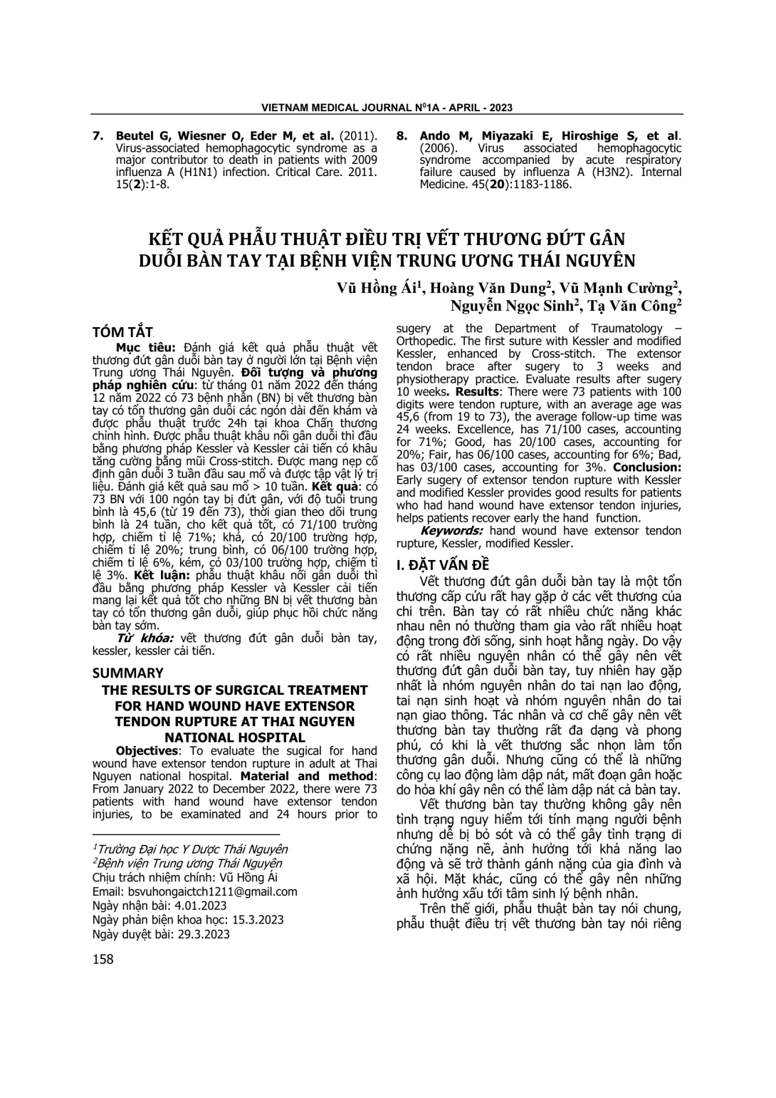 Đánh giá kết quả phẫu thuật vết thương đứt gân duỗi bàn tay ở người lớn tại Bệnh viện Trung ương Thái Nguyên. Đối tượng và phương pháp nghiên cứu: từ tháng 01 năm 2022 đến tháng 12 năm 2022 có 73 bệnh nhân (BN) bị vết thương bàn tay có tổn thương gân duỗi các ngón dài đến khám và được phẫu thuật trước 24h tại khoa Chấn thương chỉnh hình. Được phẫu thuật khâu nối gân duỗi thì đầu bằng phương pháp Kessler và Kessler cải tiến có khâu tăng cường bằng mũi Cross-stitch. Được mang nẹp cố định gân duỗi 3 tuần đầu sau mổ và được tập vật lý trị liệu. Đánh giá kết quả sau mổ > 10 tuần. Kết quả: có 73 BN với 100 ngón tay bị đứt gân, với độ tuổi trung bình là 45,6 (từ 19 đến 73), thời gian theo dõi trung bình là 24 tuần, cho kết quả tốt, có 71/100 trường hợp, chiếm tỉ lệ 71%; khá, có 20/100 trường hợp, chiếm tỉ lệ 20%; trung bình, có 06/100 trường hợp, chiếm tỉ lệ 6%, kém, có 03/100 trường hợp, chiếm tỉ lệ 3%. Kết luận: phẫu thuật khâu nối gân duỗi thì đầu bằng phương pháp Kessler và Kessler cải tiến mang lại kết quả tốt cho những BN bị vết thương bàn tay có tổn thương gân duỗi, giúp phục hồi chức năng bàn tay sớm.