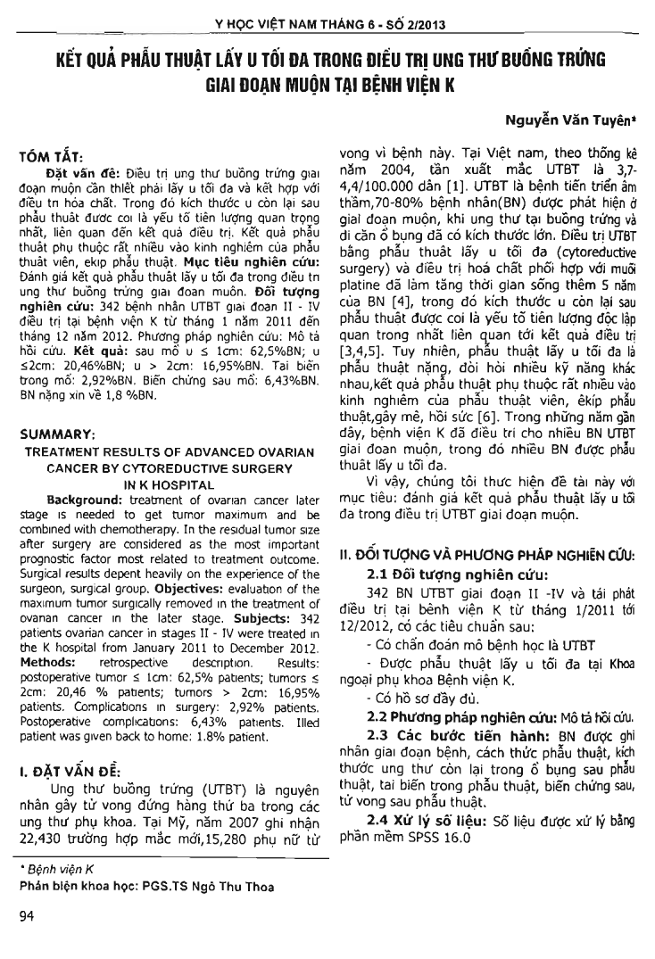 Background: treatment of ovarian cancer later stage is needed to get tumor maximum and be combined with chemotherapy. In the residual tumor size after surgery are considered as the most important prognostic factor most related to treatment outcome. Surgical results depent heavily on the experience of the surgeon, surgical group. Objectives: evaluation of the maximum tumor surgically removed in the treatment of ovarian cancer in the later stage. Subjects: 342 patients ovarian cancer in stages II - IV were treated in the K hospital from January 2011 to December 2012. Methods: retrospective description. Results: postoperative tumor: or 2cm: 20,46 percent patients; tumors 2cm: 16,95 percent patients. Complications in surgery: 2,92 percent patients. Postoperative complications: 6,43 percent patients. Illed patient was given back to home: 1.8 percent patient.
